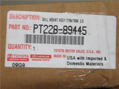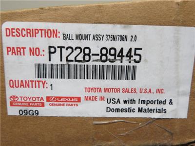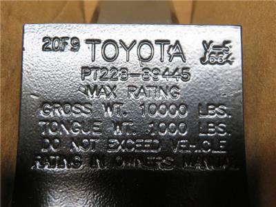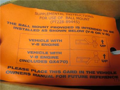 VF new unused OEM Toyota Ball Mount assembly in original box. Rated for gross wt of 10000 lbs. and is suitable for use with V6 & V8 engines with instructions tag affixed. includes a 3 pc pin assembly which secures to hitch. No ball included
