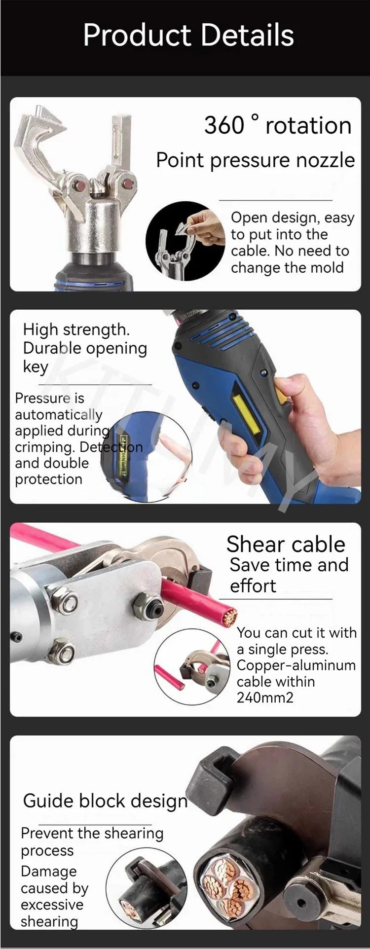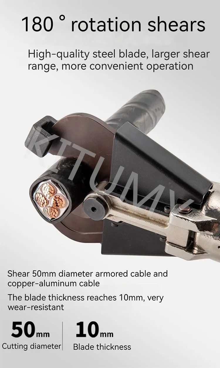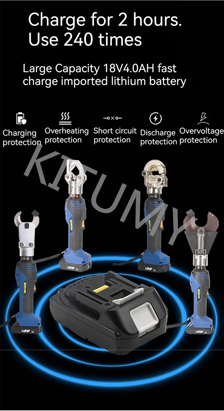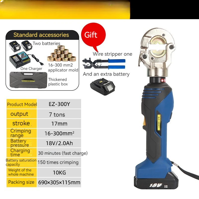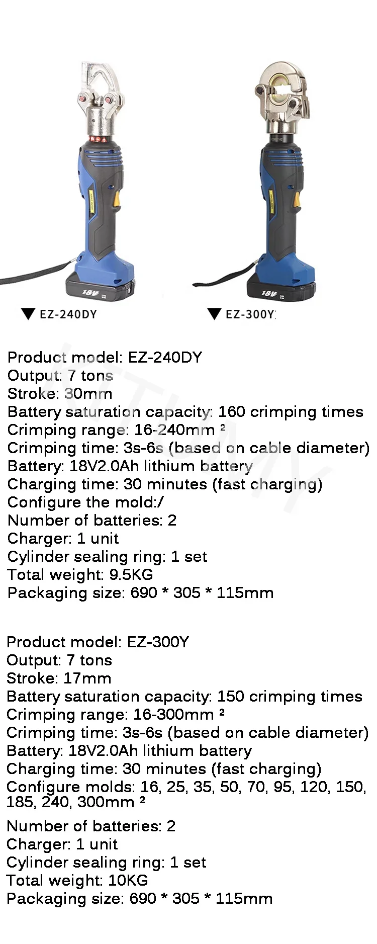 Product model: EZ-30D Output: 6.5 tons Stroke: 35mm Battery saturation capacity: 90 shear times Maximum shear range: Φ 28mm (240mm ²) Copper/aluminum wire Φ 19mm (120mm ²) Steel core aluminum stranded wire Battery: 18V2.0Ah lithium battery Charging time: 30 minutes (fast charging) Number of batteries: 2 Charger: 1 unit Cylinder sealing ring: 1 set Product model: EZ-50D Output: 6 tons Stroke: 38mm Battery saturation capacity: 40 shear times Maximum shear range: Φ 50mm (copper aluminum wire and armored cable) Battery: 18V2.0Ah lithium battery Charging time: 30 minutes (fast charging) Number of batteries: 2 Charger: 1 unit Cylinder sealing ring: 1 set Product model: EZ-240DY Output: 7 tons Stroke: 30mm Battery saturation capacity: 160 crimping times Crimping range: 16-240mm ² Crimping time: 3s-6s (based on cable diameter) Battery: 18V2.0Ah lithium battery Charging time: 30 minutes (fast charging) Configure the mold:/ Number of batteries: 2 Charger: 1 unit Cylinder sealing ring: 1 set Product model: EZ-300Y Output: 7 tons Stroke: 17mm Battery saturation capacity: 150 crimping times Crimping range: 16-300mm ² Crimping time: 3s-6s (based on cable diameter) Battery: 18V2.0Ah lithium battery Charging time: 30 minutes (fast charging) Configure molds: 16, 25, 35, 50, 70, 95, 120, 150, 185, 240, 300mm ² Number of batteries: 2 Charger: 1 unit Cylinder sealing ring: 1 set