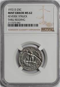 You are bidding on a 1972 D NGC MS62 Massive Struck Thru Reeding Quarter Error Amazing Eye Appeal. Errors are becoming very rare as the mint has put in systems in 2002 to virtually stop all majors errors from getting out of the mint. Please check my very positive feedback. Shipping and handling $2.95. Please check out my other ERROR COIN Auctions this week.