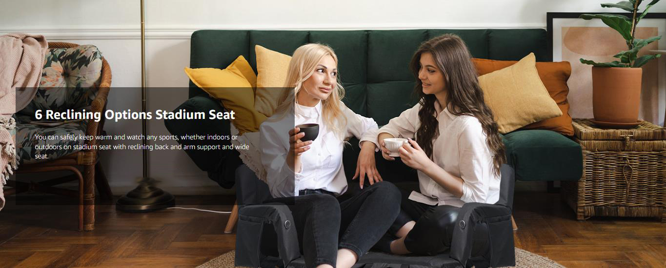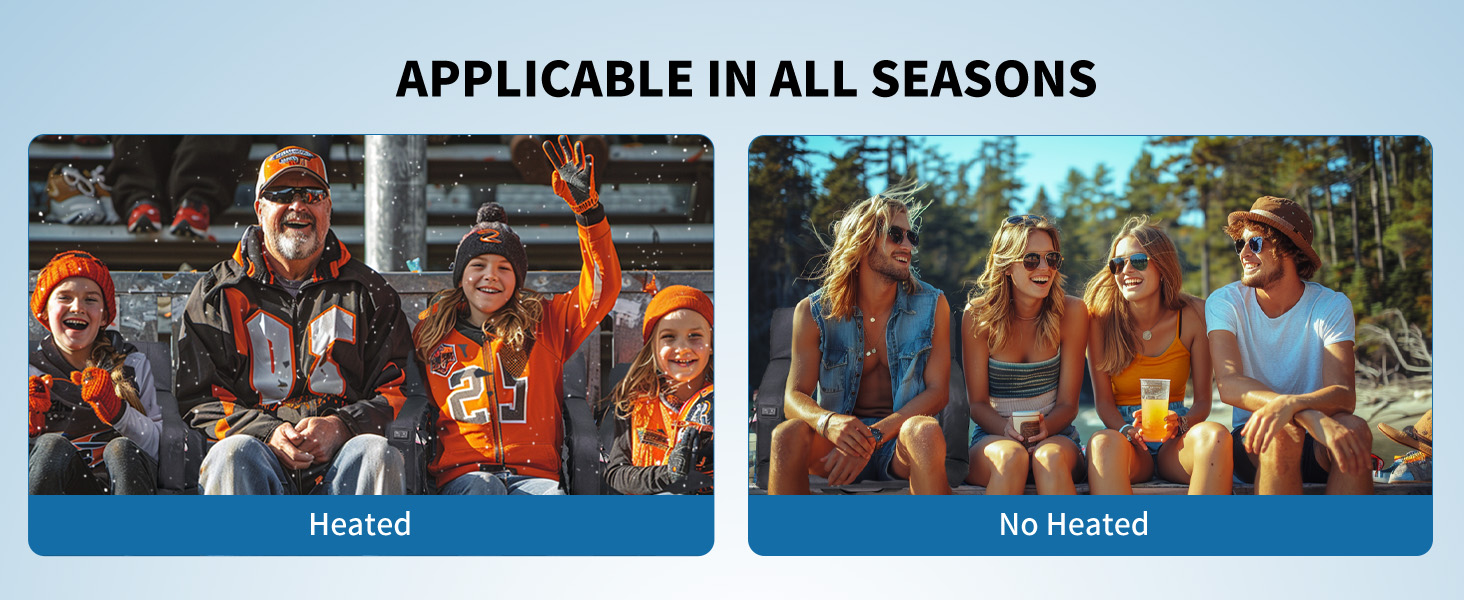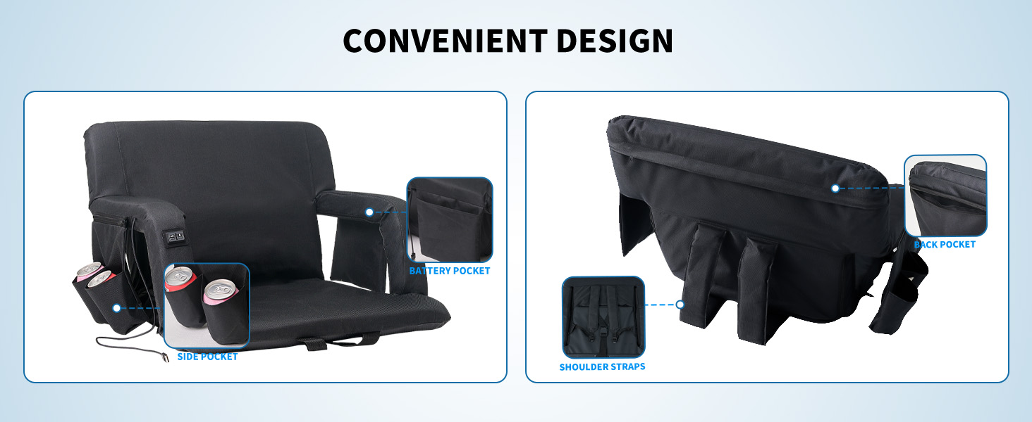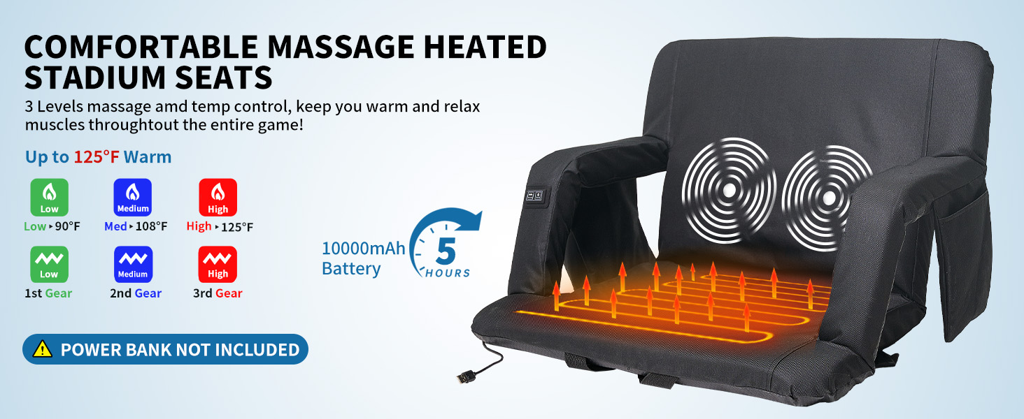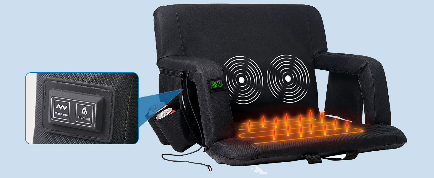 Heated Massage Stadium Seats: The heatable stadium seat features two massagers built into the backrest, providing soothing relief to tired muscles. Simply lean back and let the massagers do the work. Choose from six different angles to find your ideal sitting position for ultimate relaxation, immersive viewing, or any purpose you desire. Adjustable Heat Levels: 3 Levels of Heat&Massage. Stay warm and comfortable during chilly games with the heated stadium seat's adjustable temperature settings. Choose from multiple heat levels to customize your experience and stay cozy all game long. Two Size Options and Convenient: Heated massage chair comes in two sizes: 21'' regular and 25'' extra-wide. You can take it with you wherever you go, and enjoy the warmth and comfort of your own heated seat, no matter where you are. Durable and High-Quality: This bleacher chair is made with high-quality materials, ensuring that it is durable and long-lasting. You can rely on this seat to provide you with warmth and comfort season after season, making it a worthwhile investment for anyone who spends a lot of time outdoors. Versatile and Multi-Purpose: Designed with your convenience in mind, our seat features multi-purpose pockets. This stadium seat can be used in a variety of situations, making it a versatile and multi-purpose product. Whether you're watching a sports game, camping, or simply spending time outdoors, this seat will keep you warm, comfortable, and relaxed with its heating and massaging features.