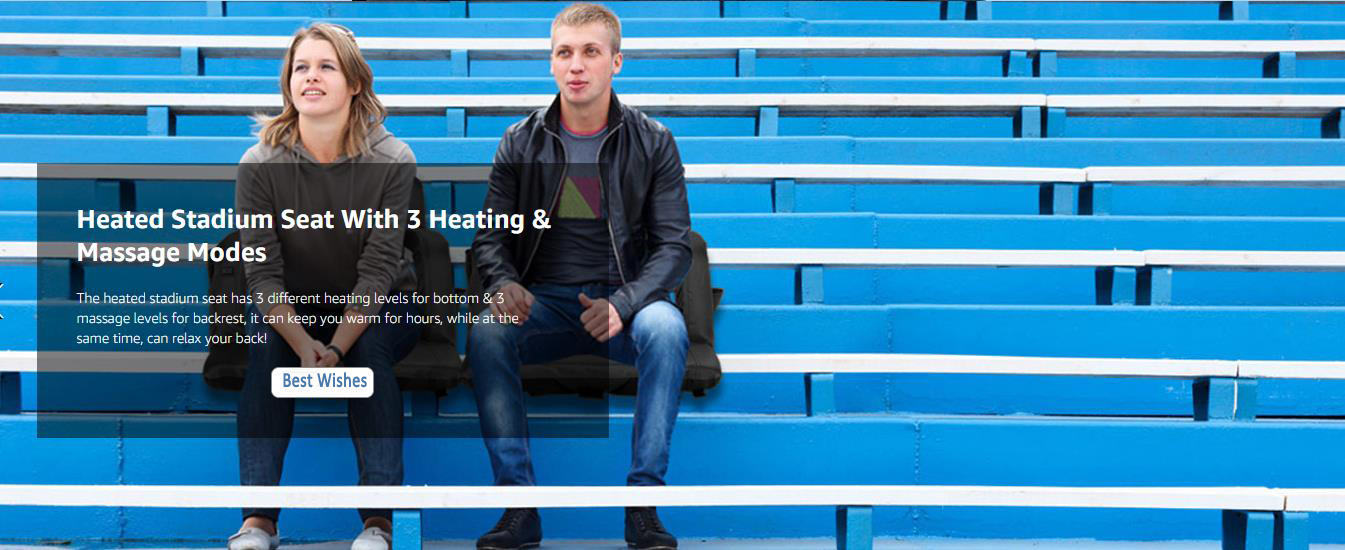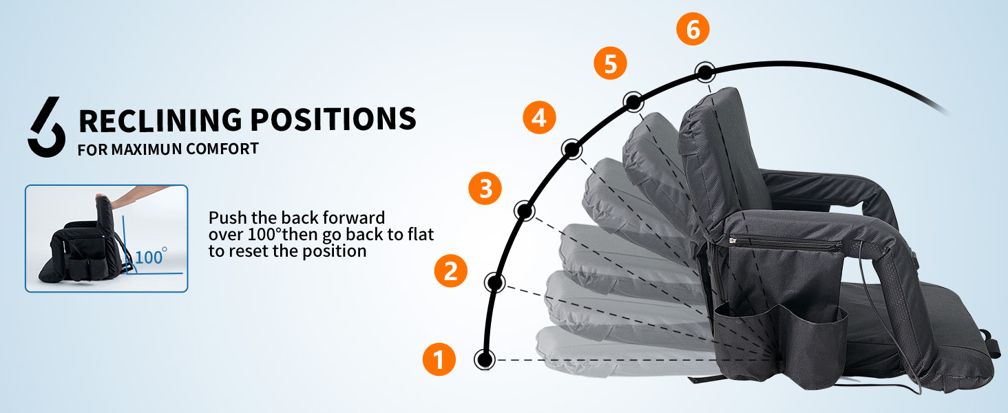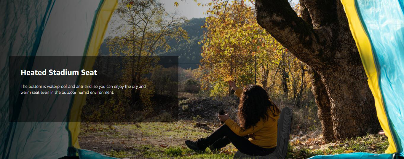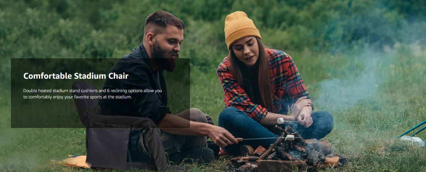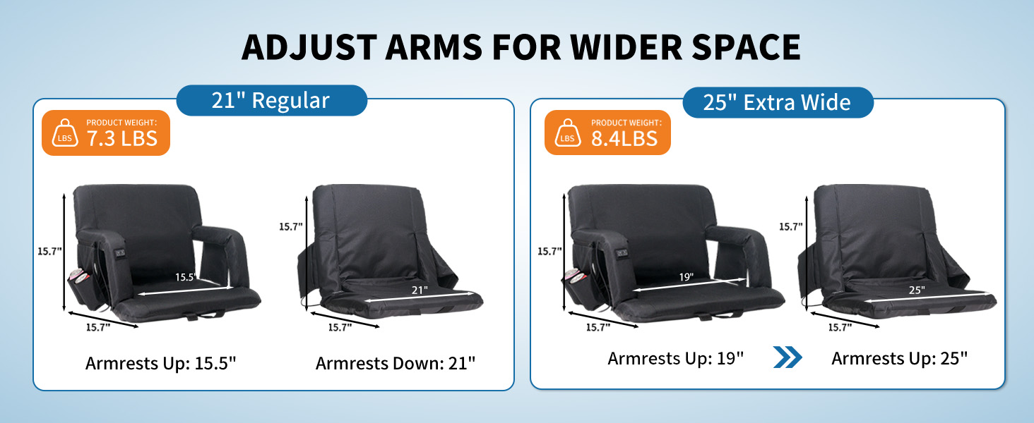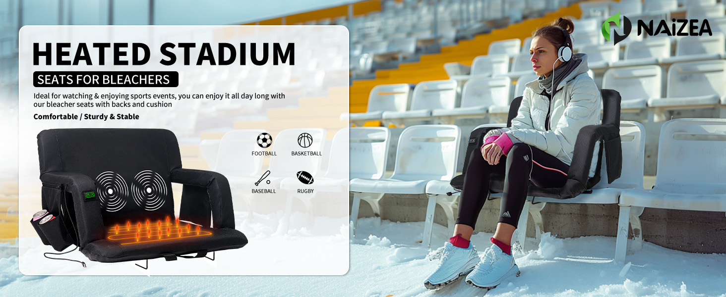 Heated Massage Stadium Seats: The heatable stadium seat features two massagers built into the backrest, providing soothing relief to tired muscles. Simply lean back and let the massagers do the work. Choose from six different angles to find your ideal sitting position for ultimate relaxation, immersive viewing, or any purpose you desire. Adjustable Heat Levels: 3 Levels of Heat&Massage. Stay warm and comfortable during chilly games with the heated stadium seat's adjustable temperature settings. Choose from multiple heat levels to customize your experience and stay cozy all game long. Two Size Options and Convenient: Heated massage chair comes in two sizes: 21'' regular and 25'' extra-wide. You can take it with you wherever you go, and enjoy the warmth and comfort of your own heated seat, no matter where you are. Durable and High-Quality: This bleacher chair is made with high-quality materials, ensuring that it is durable and long-lasting. You can rely on this seat to provide you with warmth and comfort season after season, making it a worthwhile investment for anyone who spends a lot of time outdoors. Versatile and Multi-Purpose: Designed with your convenience in mind, our seat features multi-purpose pockets. This stadium seat can be used in a variety of situations, making it a versatile and multi-purpose product. Whether you're watching a sports game, camping, or simply spending time outdoors, this seat will keep you warm, comfortable, and relaxed with its heating and massaging features.