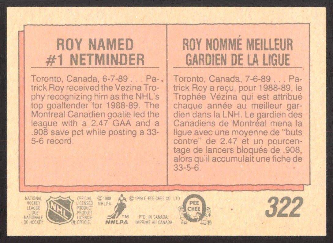 1989-90 O-Pee-Chee Patrick Roy Montreal Canadiens #322