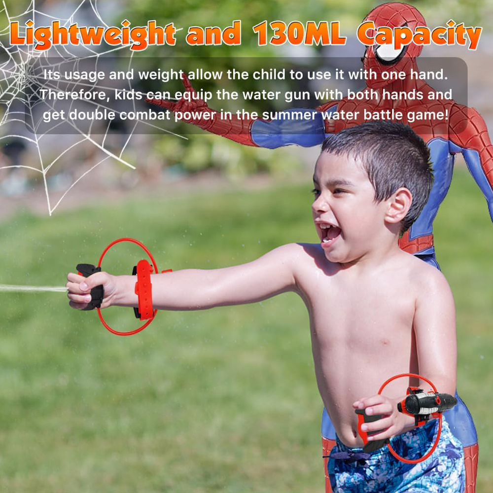 A popular activity on a hot summer day is to have a cool water game. This summer game is a favorite with children and adults alike. A strong water gun is just essential. The spider web water gun adopts a novel wrist-worn design. Consists of a soft rubber strap, a water jet launcher, and a superhero glove. Wear it as if you were a superhero spraying water to protect the earth and your family.