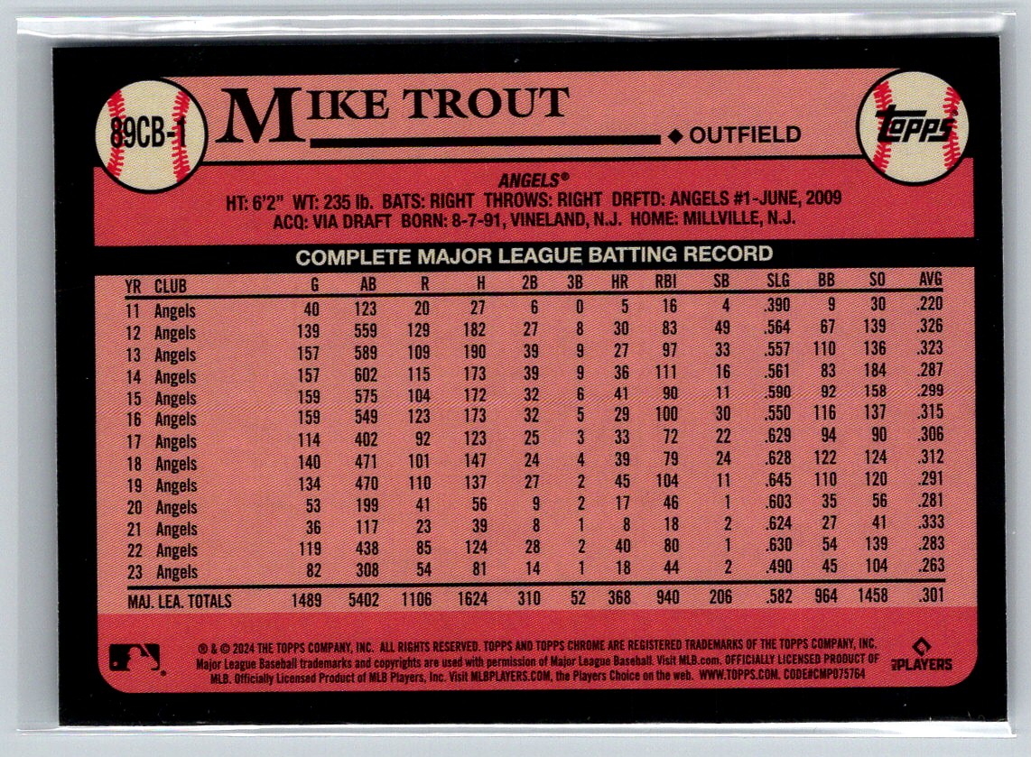 | 2024 TOPPS CHROME 1989 BASEBALL CHROME MIKE TROUT LOS ANGELES ANGELS #89CB-1 |