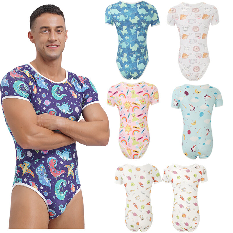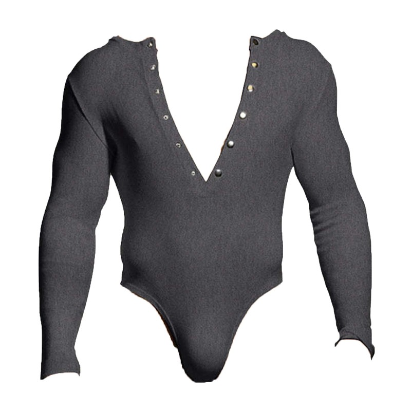 Designed with scoop neck, long sleeve, press buttons at front and crotch, tight and elastic to fit body.