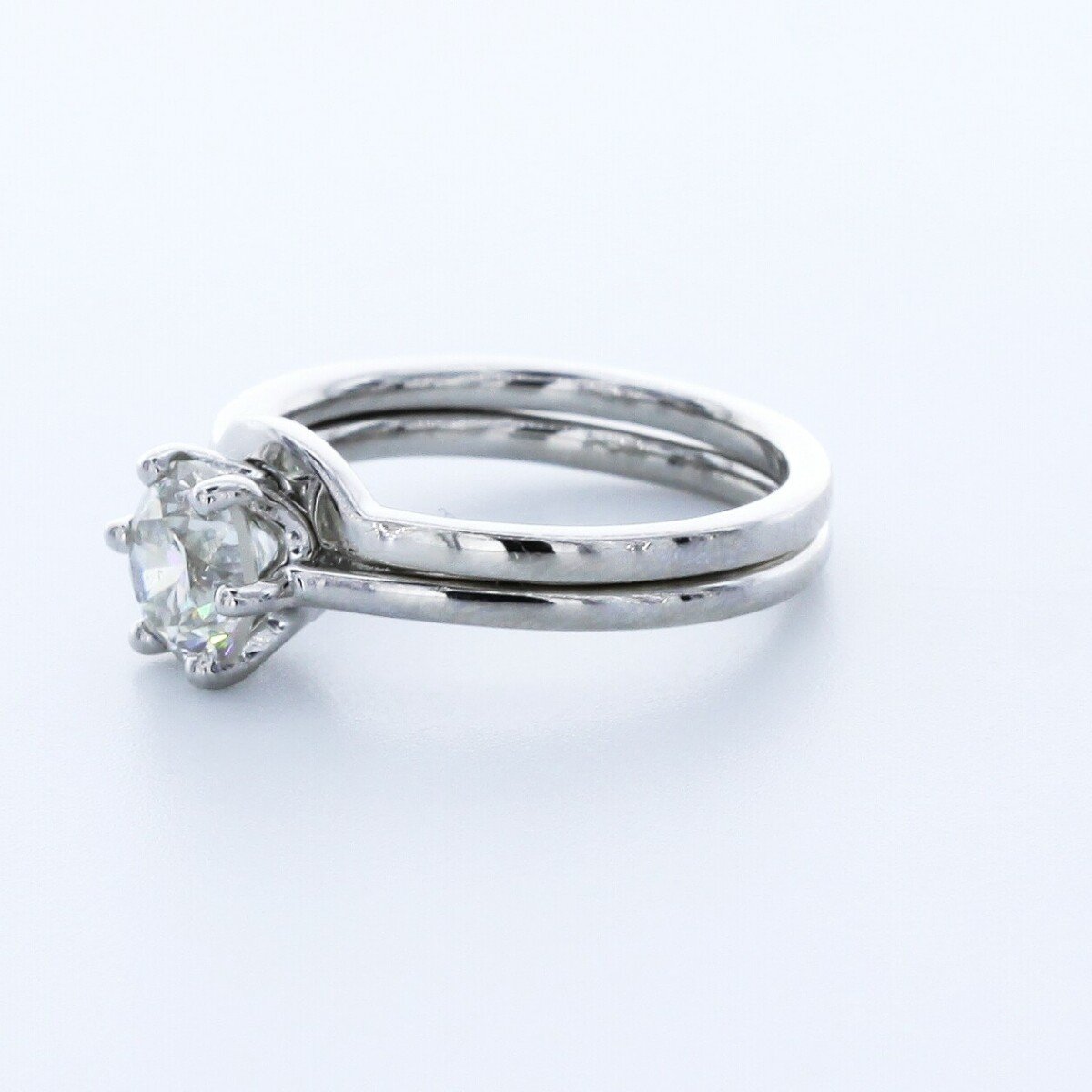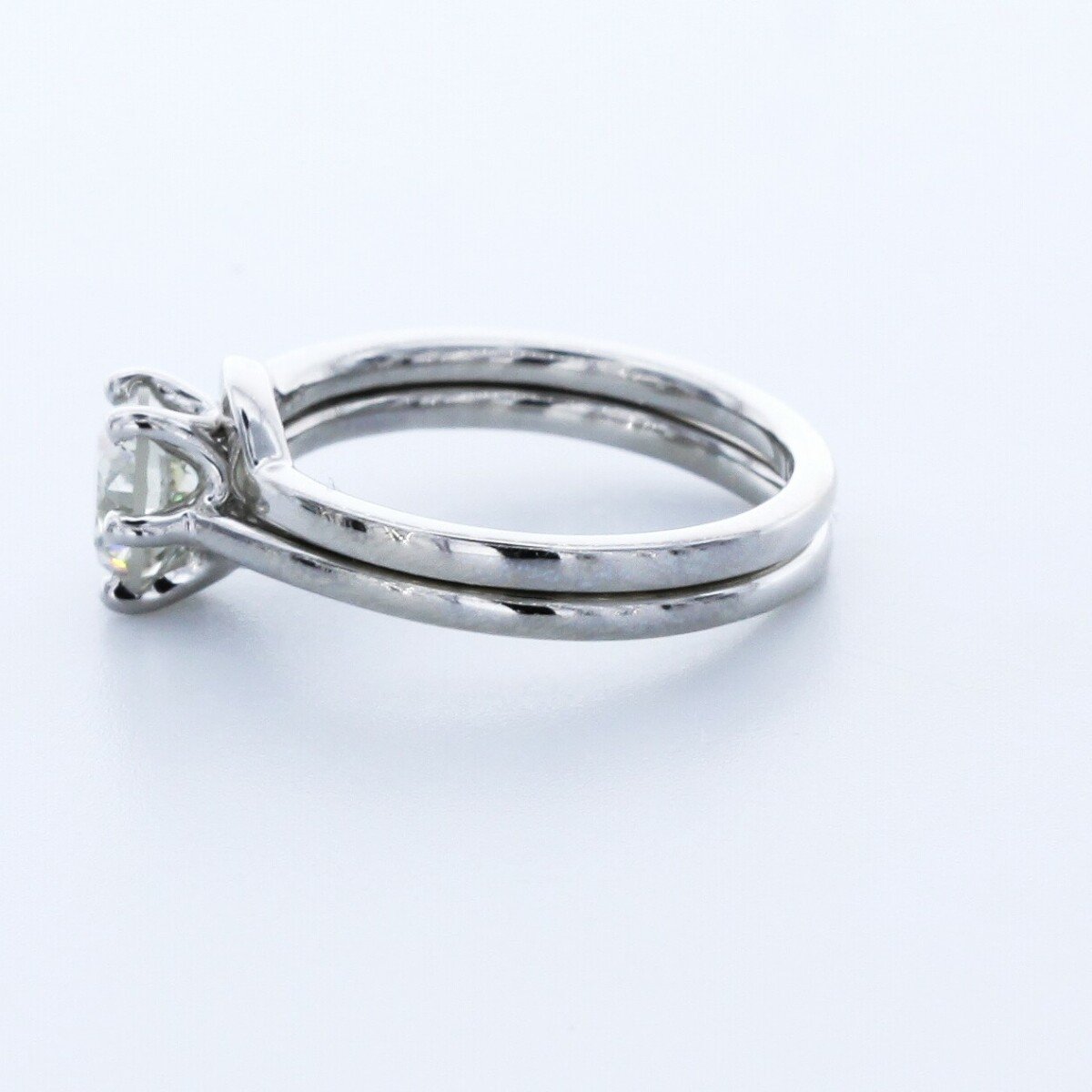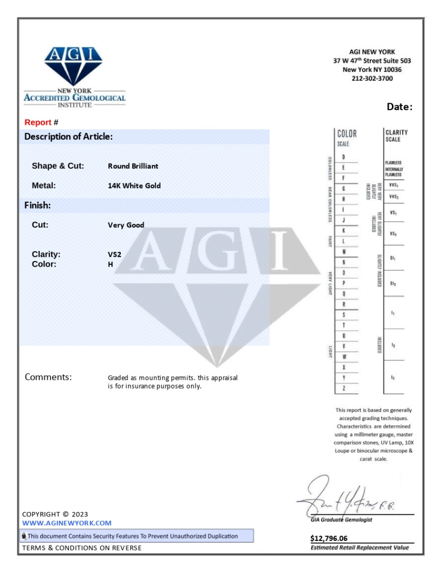 Capture the moment with this 14k white gold solitaire ring with band with matching band. The center round diamond, weighs 1.50 carats, is certified by AGI Gemological Laboratories as a Natural Diamond with H color, VS2 clarity enhanced, with very good cut and proportions. Our jewelry designer chose a 6 prong setting to accentuate the glow of the diamond on this striking piece. This item will come with a 3rd party certificate and an estimate appraisal value of $16,180