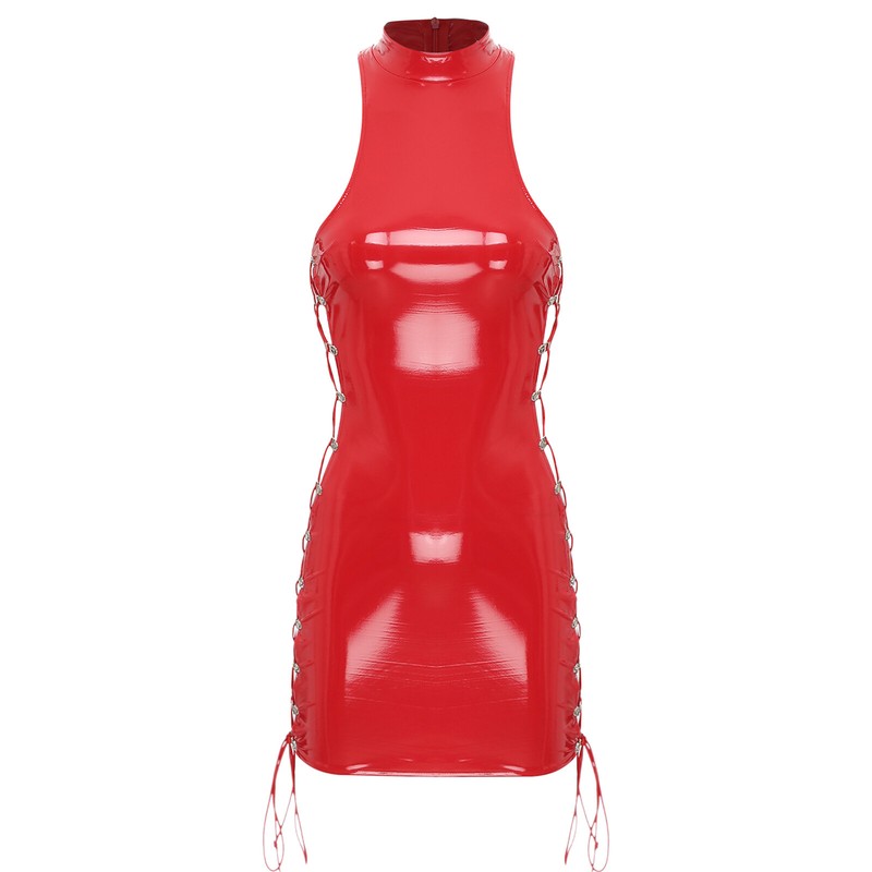 Designed with mock neck, sleeveless, side cutout, side lace-up with metal eyelets, slim fit and back zipper closure, making you sexy.