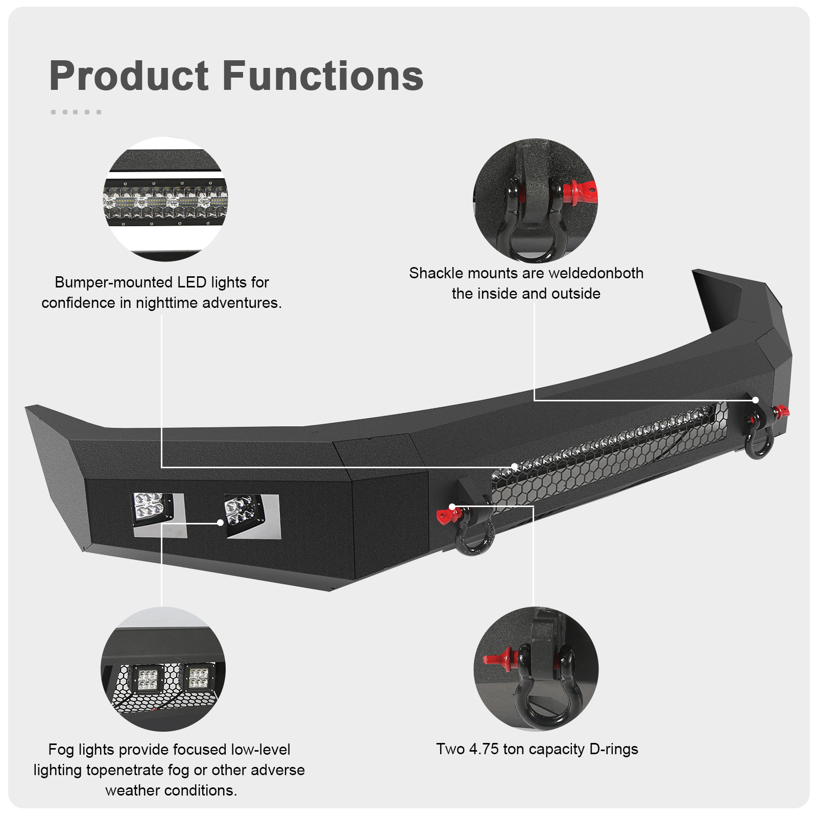 The Bumper-mounted 1 LED Light and 4 Fog Lights Unique Design-which is Confidence in Nighttime Adventures and make Your Car More Cool.