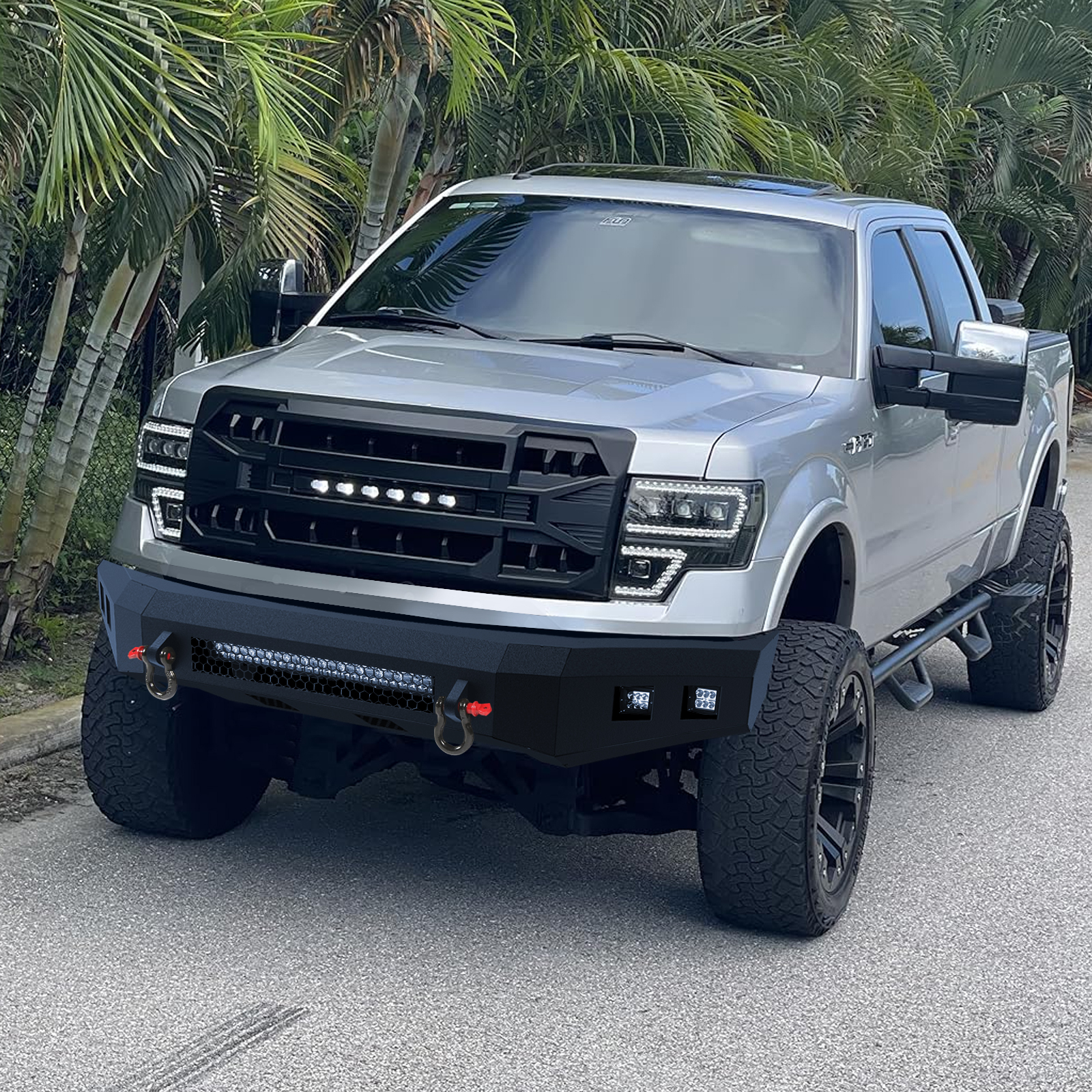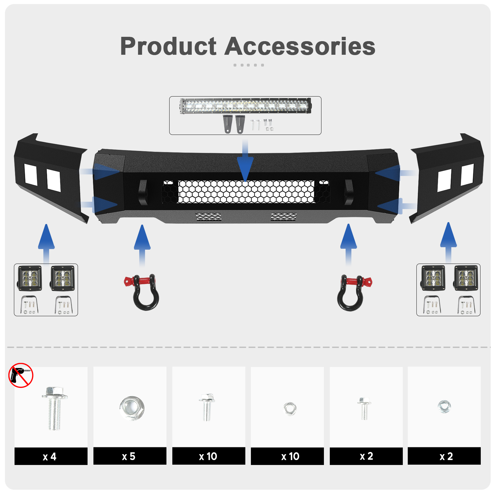 Package Included 1x Front Bumper 4x Fog Square LED Lights 2x Side Small Yellow Lights 1x Bumper-mounted Rectangle LED Light All Mounting Hardware 1 x DIY Installation Manual |