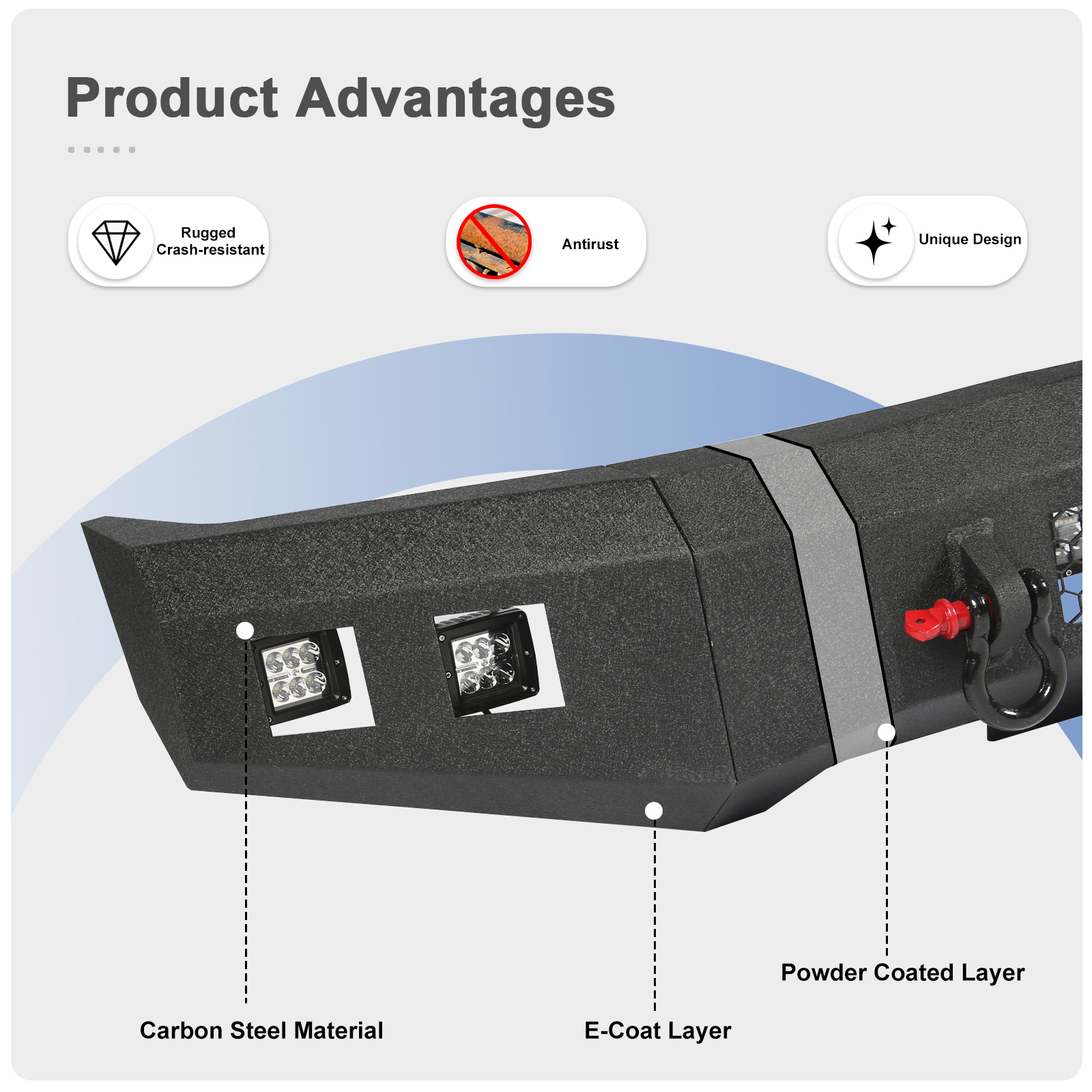 Heavy-duty Carbon Steel and Painting Surface (3mm Material Thickness,Q235 Carbon Steel and 126um Coating Thickness) make our Bumper more Corrosion-resistant and Durable.