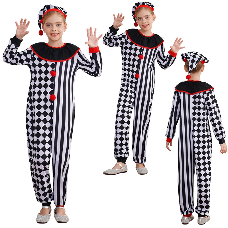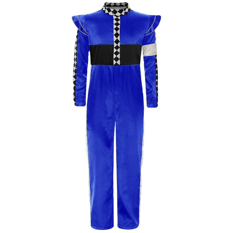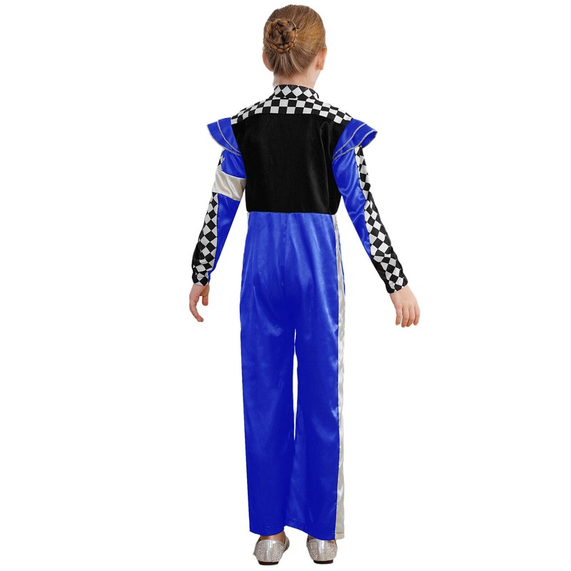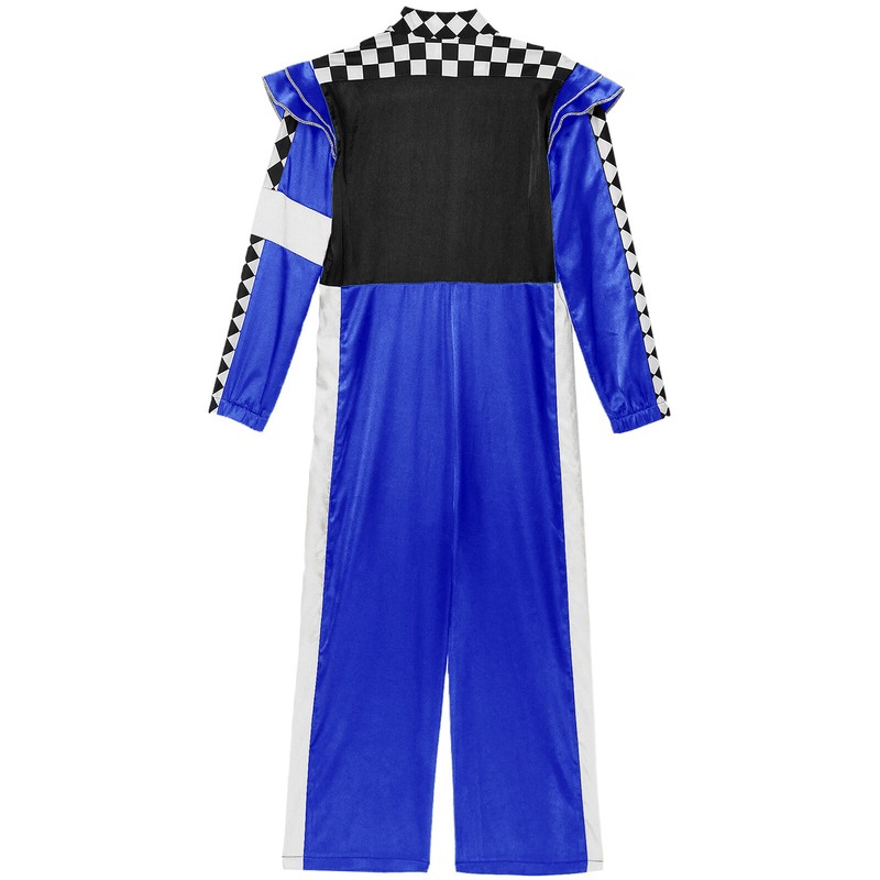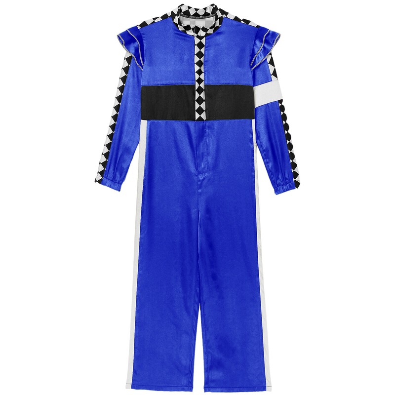 A racer cosplay costume for child size, is designed with bright colors and checkerboard pattern.