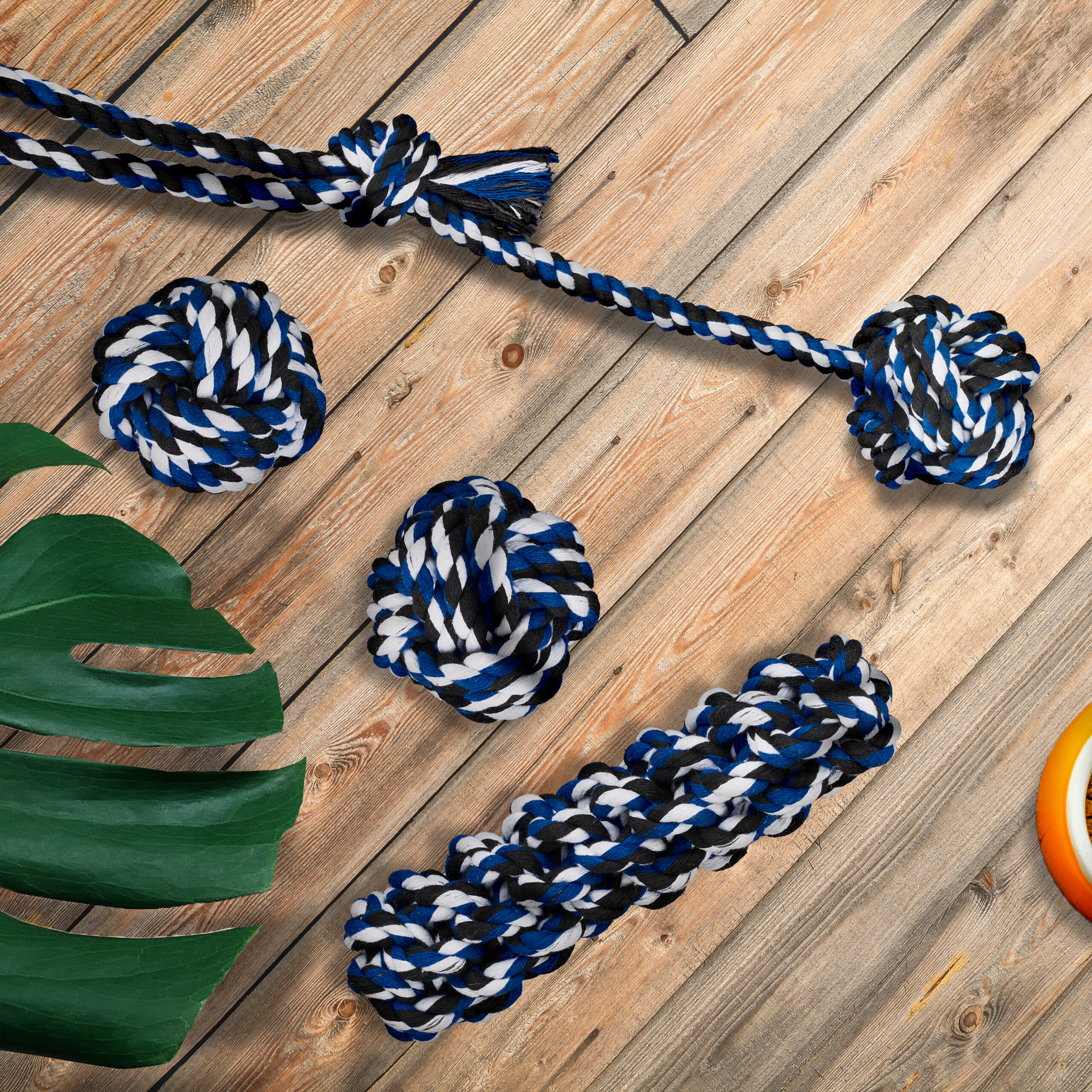 - Vielseitig: 4-teiliges Hundespielzeug-Set besteht aus 2 Knotenbällen, Wurfball mit Kordel und Rolle