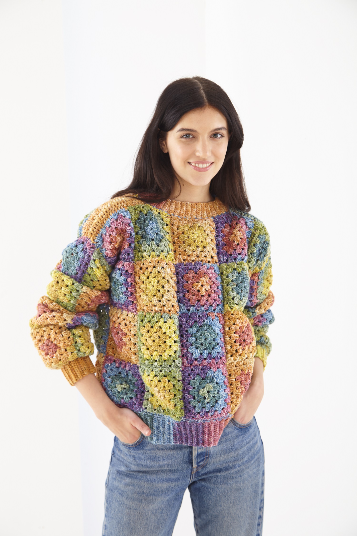 This double knit Crochet pattern leaflet 6258 by King Cole will instruct you on how to create a ladies cardigan & jumper using granny squares.