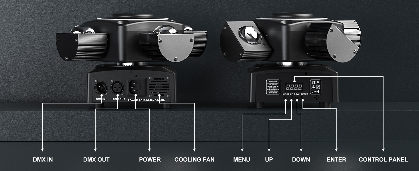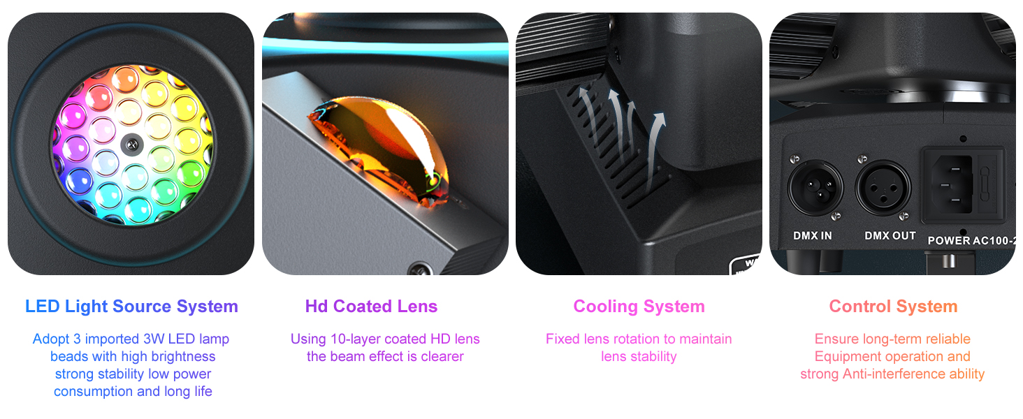 3.【Support multi-modes】Supports international standard DMX, self-moving, sound control, and master-slave modes for versatile applications.