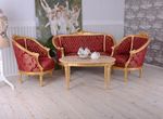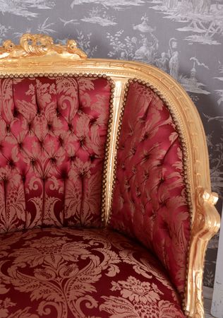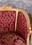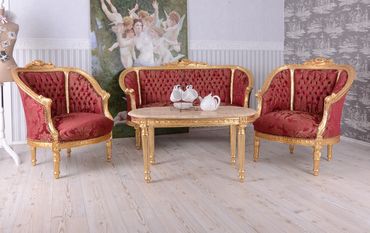 Diese elegante Barock-Sitzgruppe „Schloss Sanssouci“ vereint königlichen Stil mit handwerklicher Meisterleistung. Das Set besteht aus einem großzügigen Sofa, zwei Sesseln und einem edlen Couchtisch mit Marmorplatte im klassischen Rokoko-Design des 18. Jahrhunderts. Der reich verzierte Zargenrahmen aus Holz besticht durch aufwendige Schnitzereien und eine Oberfläche, die im Antik-Look patiniert wurde – jedes Möbelstück ist ein handgefertigtes Unikat. Die geschwungene Form und der dekorative Bezugsstoff schaffen ein nobles Ambiente, das jeden Salon in einen prachtvollen Barockraum verwandelt. Das Sofa bietet mit einer Breite von ca. 170 cm, einer Höhe von ca. 95 cm und einer Tiefe von ca. 85 cm viel Platz zum Verweilen. Die Sessel sind ca. 85 cm breit, 95 cm hoch und 85 cm tief und sorgen mit einer Sitzhöhe von ca. 45 cm für komfortables Sitzen. Der Couchtisch misst ca. 105 cm in der Breite, 65 cm in der Tiefe und 47 cm in der Höhe, seine aufliegende Marmorplatte verleiht dem Ensemble zusätzliche Eleganz. Diese Barock-Sitzgruppe ist ideal für alle, die klassische französische Wohnkultur im Rokoko-Stil mit hochwertigen Materialien und traditioneller Handarbeit schätzen.