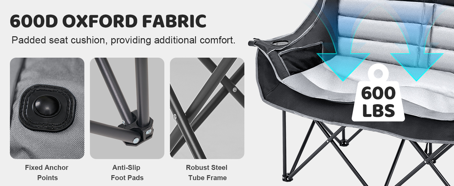 【Comfortable Camping Loveseat】Easily fits two people comfortably. Extra padding provides ultimate comfort. Supports 600lbs. Great for couples!