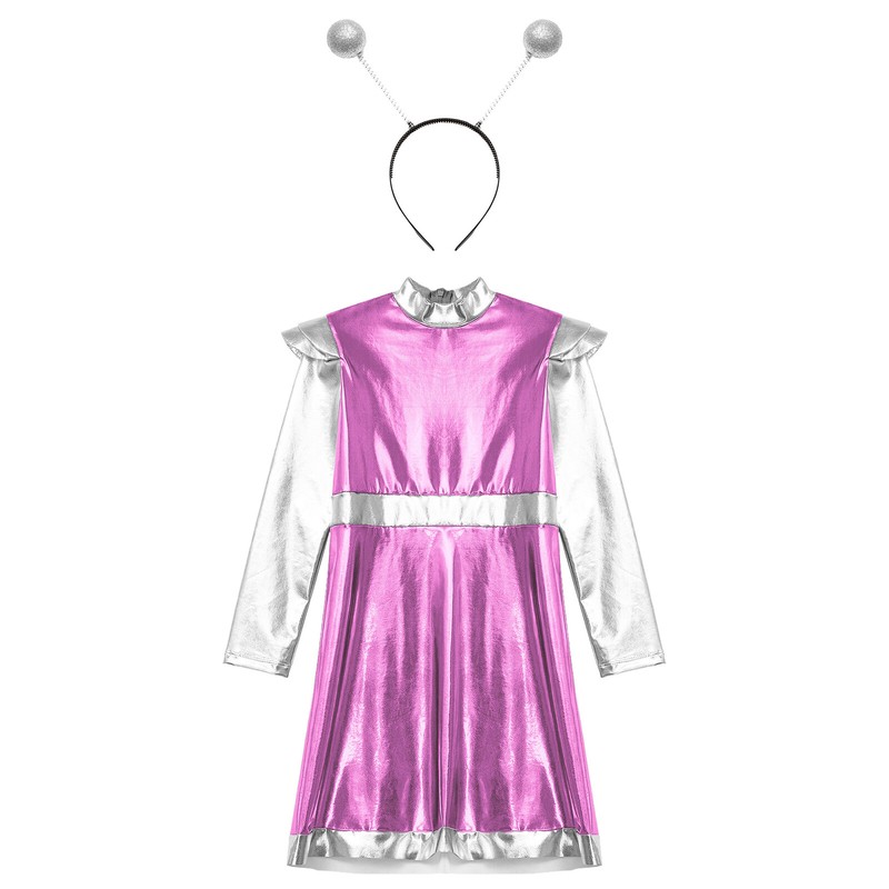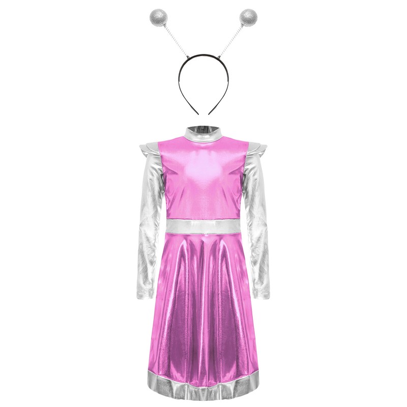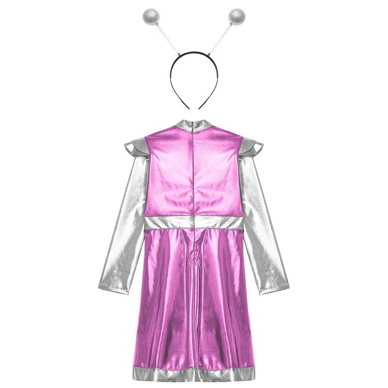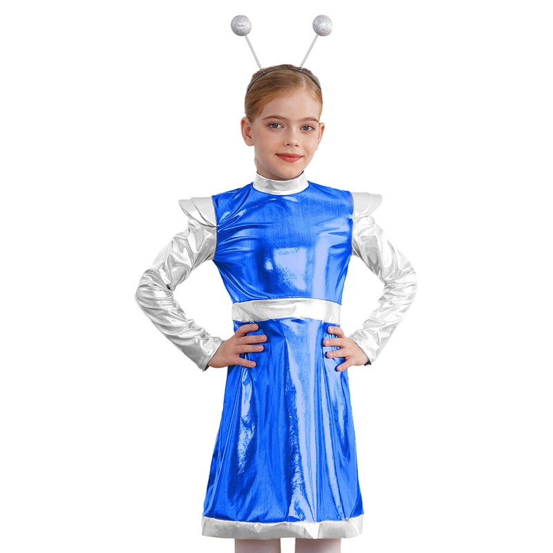 Alien cosplay costume for child size, designed with mock neck, long sleeve, shoulder pads, high waist a-line dress.