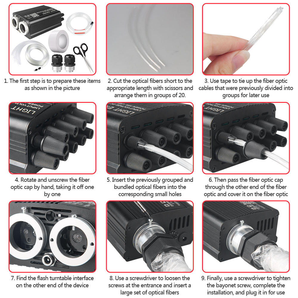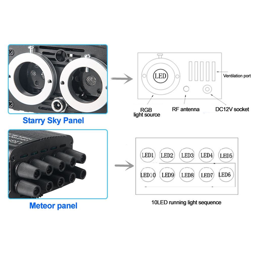 "One machine for two purposes" is used in different types of fiber optic lamps. A machine can achieve the effect of "Sky Star+Meteor". The flow mode/speed of the 10LED Meteor can be set manually.