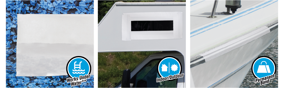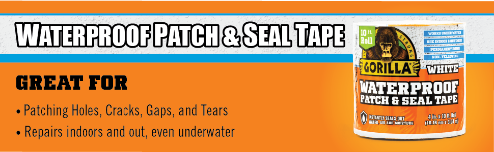 Gorilla Waterproof Patch and Seal Tape instantly seals out water, air and moisture. With an extra thick adhesive layer and UV resistant backing this tape conforms to form a permanent bond indoors and out. At 4 in. W use it to patch holes, cracks, gaps and tears, even underwater.
