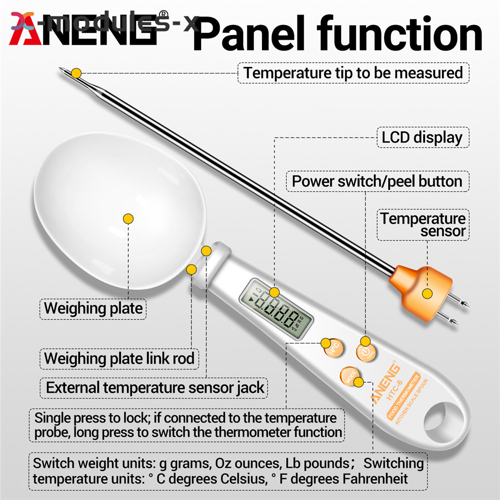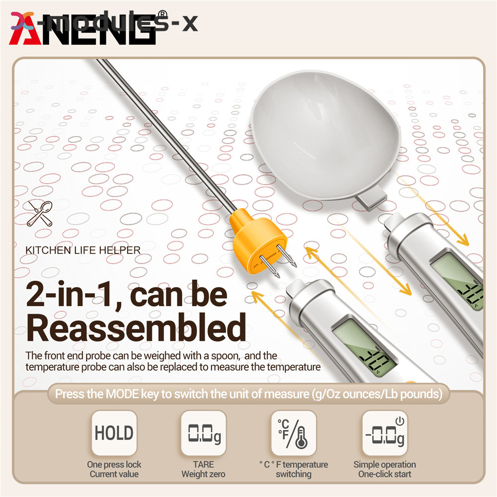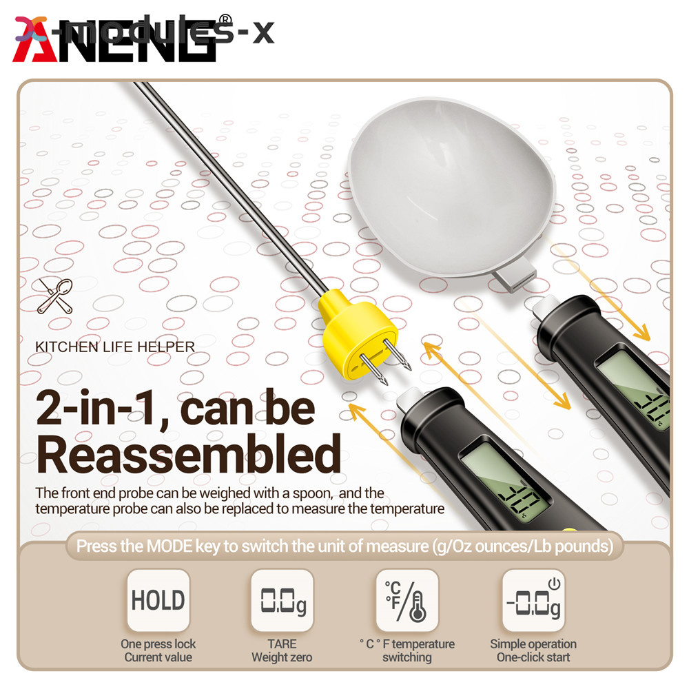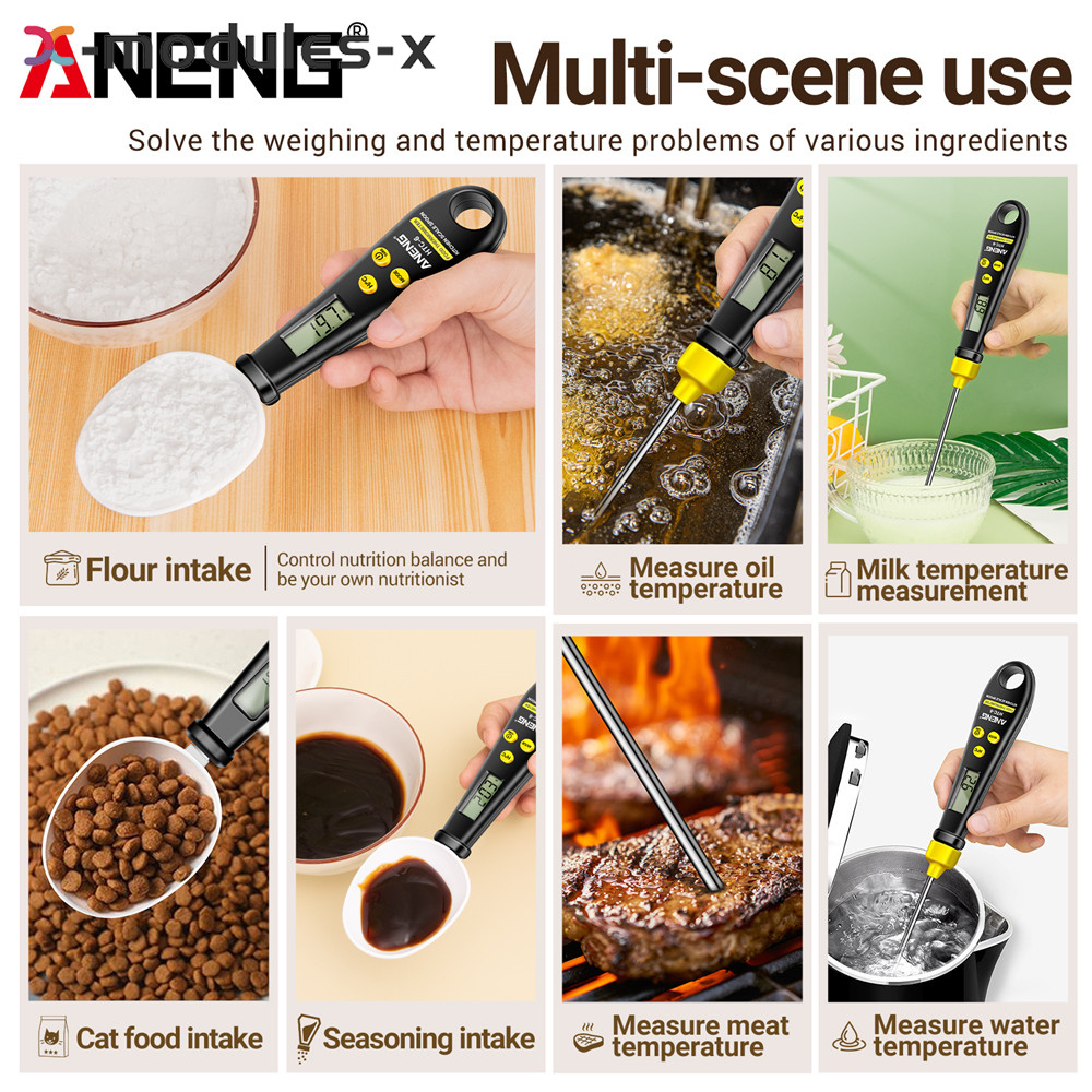 Features1. Intelligent 2-in-1 disassembled and assembled according to demand: 2-in-1 electronic measuring spoon scale + thermometer