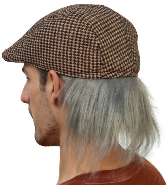 Transform into a classy senior or a grumpy old man when you wear this NEW with tags. Includes one brown and tan fabric houndstooth driving cap with attached grey synthetic straight, wispy hair in the back. Firm brim, foam lining, interior elastic for a good fit, attached fabric back flap with grey synthetic wig hair. Polyester and cotton fabric. Spot clean. For best results: remove from package and fluff wig hair into place with fingers or a soft brush. Wear with fabric-backed wig flap tucked behind ears, or draped over ears. Makes a great gift!