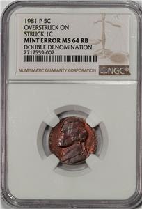 You are bidding on a 1981 NGC MS64 Nickel Struck On Struck Cent Double Denomination Mint Error Wow. Errors are becoming very rare as the mint has put in systems in 2002 to virtually stop all majors errors from getting out of the mint. Please check my very positive feedback. Shipping and handling $2.95. Please check out my other ERROR COIN Auctions this week.