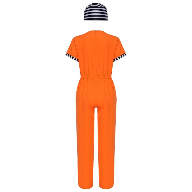 A prisoner cosplay bodysuit and hat for child size, with stripes print and embroidered number, offers a realistic experience.