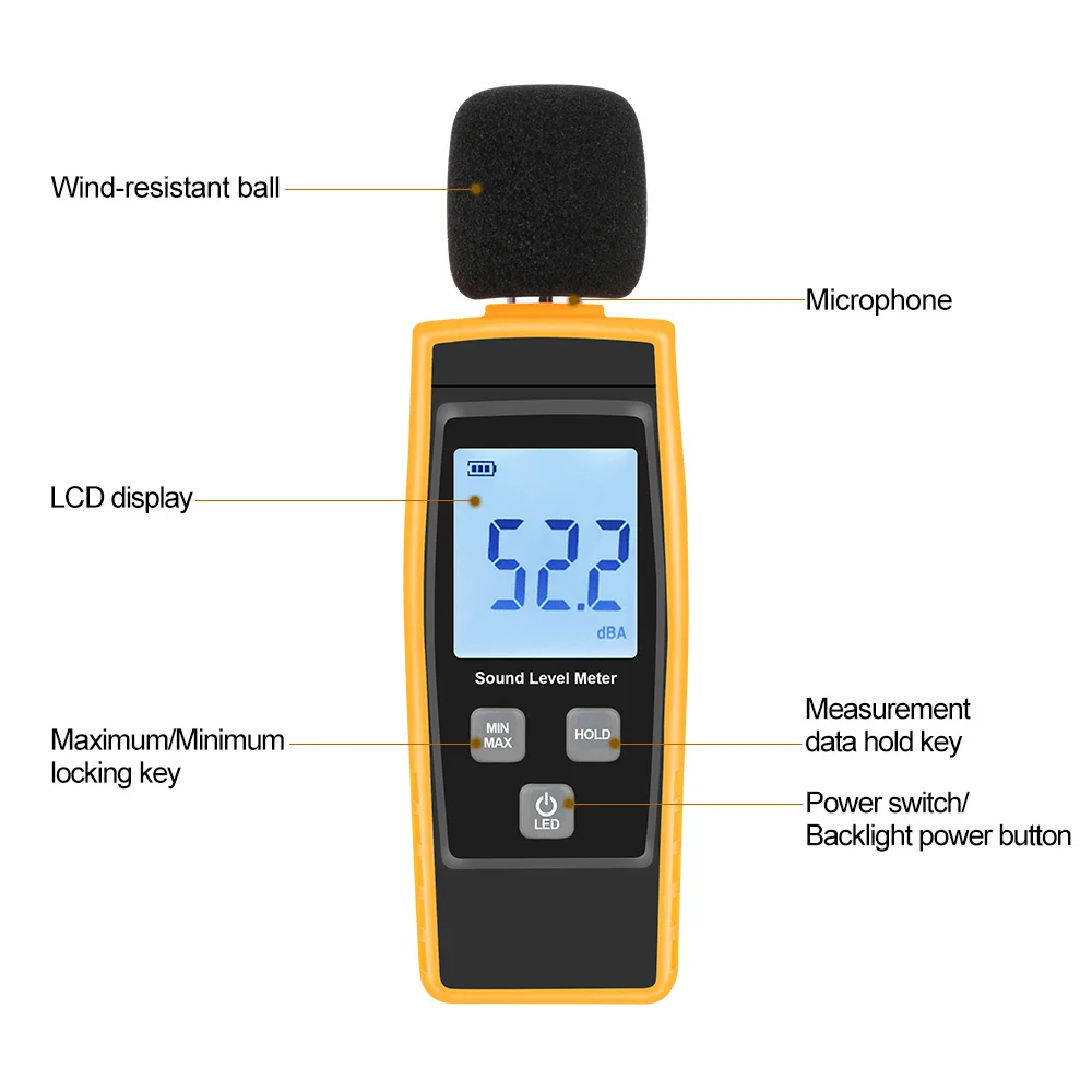 Want to test the sound level? Need to know the noise level for sound level control? Try this handy sound level meter, it's featured with wide measuring range that measures sound level from 30dBA~130dBA. It can be widely used for monitoring sound level in homes, office, schools, factories, traffic, audio system, construction site, etc.