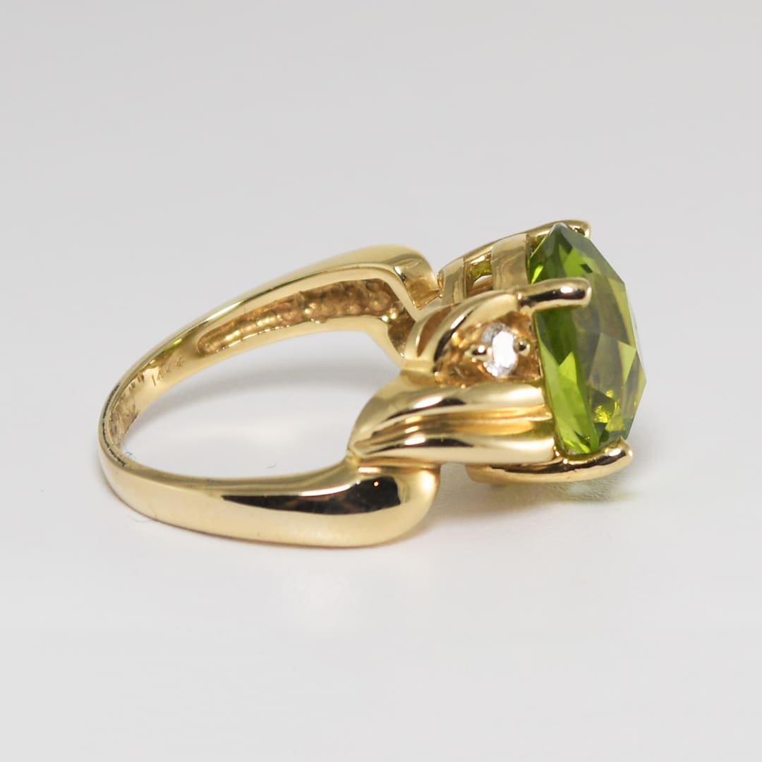 14k yellow gold ladies’ ring with a center 5.50 carat peridot gemstone.
