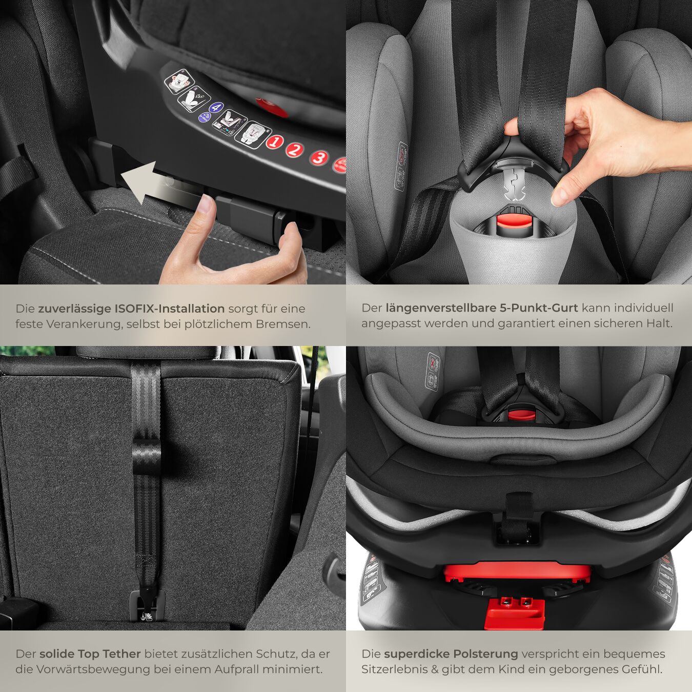 - Kinderautositz mit i-Size Zulassung (ECE R129) inklusive Seitenaufprallschutz, mit ISOFIX-Befestigung und Top Tether