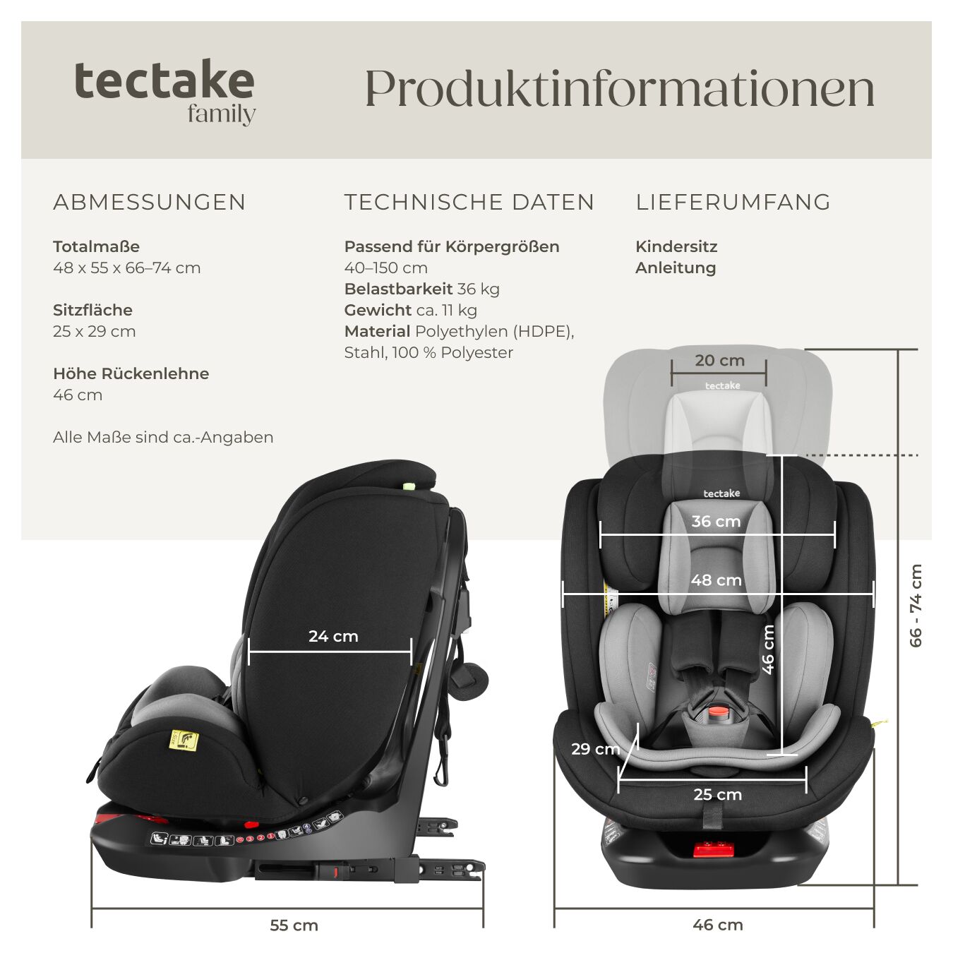 Der drehbare Autositz Linus von tectake ist ein wahrer Alltagsheld – mit seiner praktischen 360° Drehfunktion und den zwei einstellbaren Neigungswinkeln kann er sowohl vorwärtsgerichtet als auch als Reboarder rückwärtsgerichtet verwendet werden. Somit ist er bereits ab Geburt ein treuer Begleiter, der viele Jahre lang die sichere Beförderung Deines Kindes im Auto ermöglicht – bis zu einer Körpergröße von 150 cm.