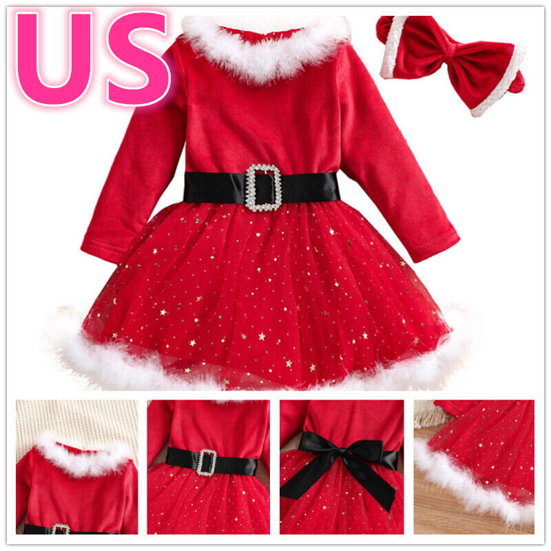 Kids Girls Christmas Long Sleeves Mesh Velvet Dress with Headband.