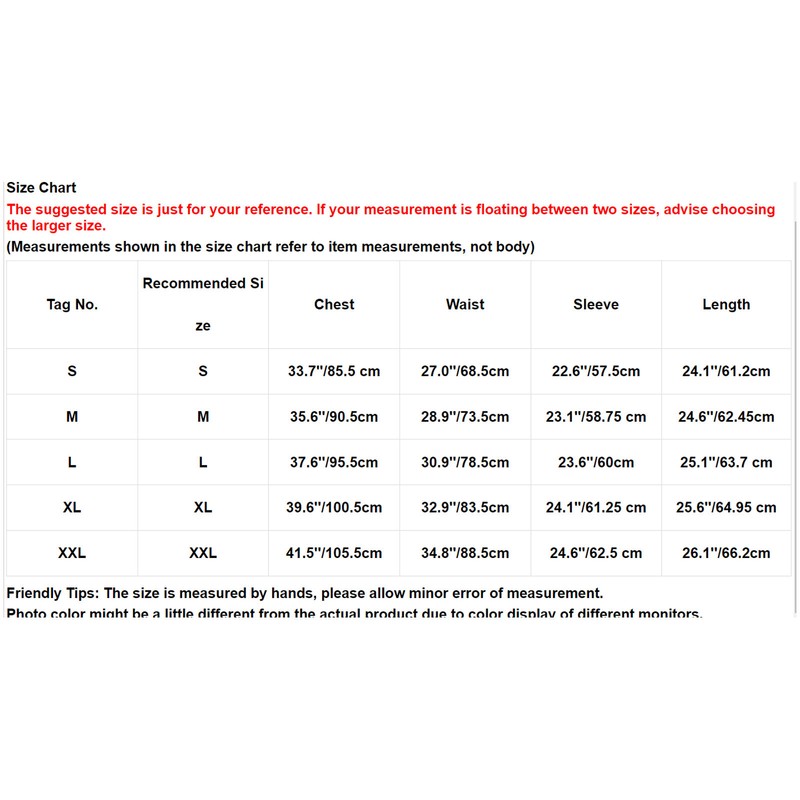 | Tag No. | Recommended Size | Chest | Waist | Sleeve | Length |
