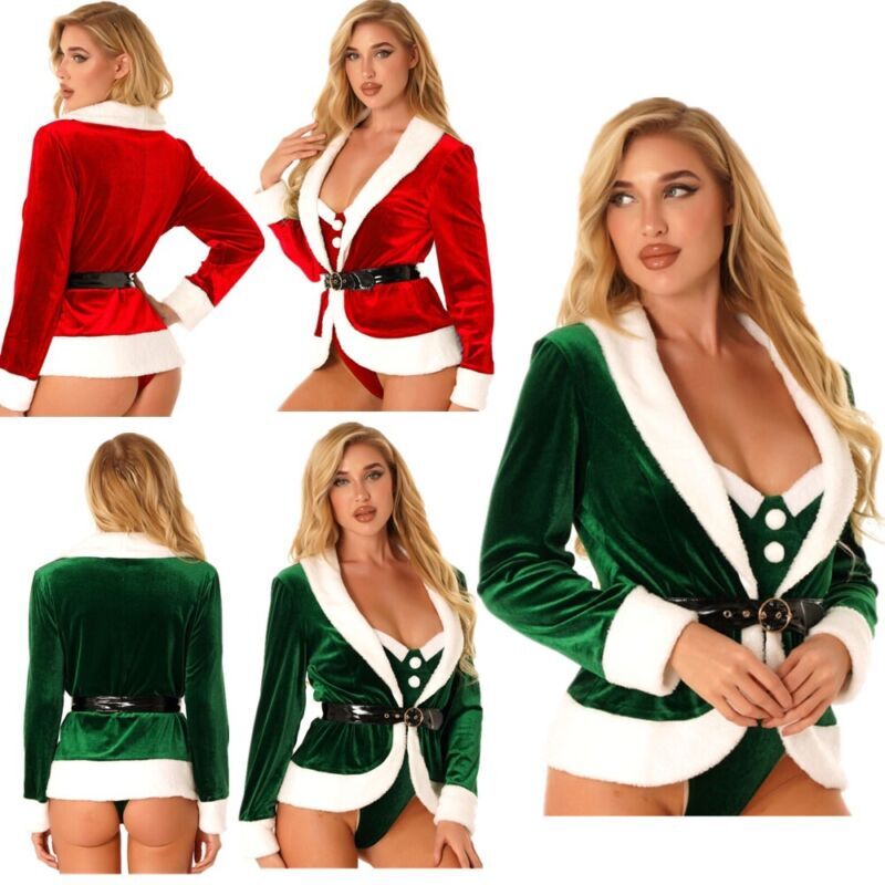 Women Christmas Santa Cosplay Costume V Neck Long Sleeves Colorblock Patchwork Belt Closure Coat.