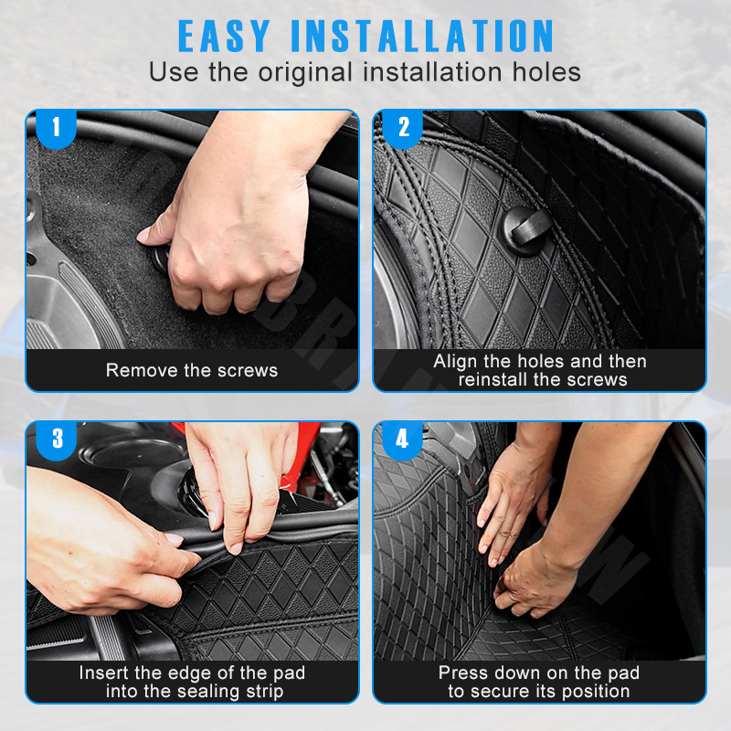 The rear trunk mats is made of artificial leather material and and are completely odorless, better injection molding process makes the surface of all weather floor mats thicker and stronger,strong flexibility of the front trunk Storage mat,folding is not easy to break,waterproof and resistant to dirt,Raised sides give extra protection, features irregular pattern for a non-slip surface surrounded by a high ridge & edges. with the protection of the Cargo Storage Mat ,you do not have to worry about the luggage will scratch or dirty.