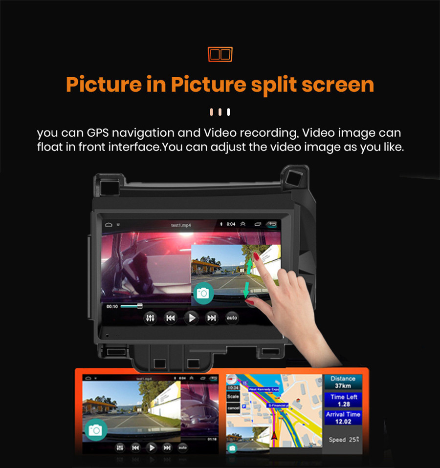 - Touch Screen: Yes - Resolution: 1024*600 - Capacitive or Resistance Screen: Capacitive - Built-in Clock and Calendar: Yes, show real time and can use network-provided time - Main Menu Status Bar display: Can be changed to Music/Radio/BT-Stereo Player and Clock/Date/Week - Change Apps-Icon Position: Yes - Picture in picture split screen:Yes |