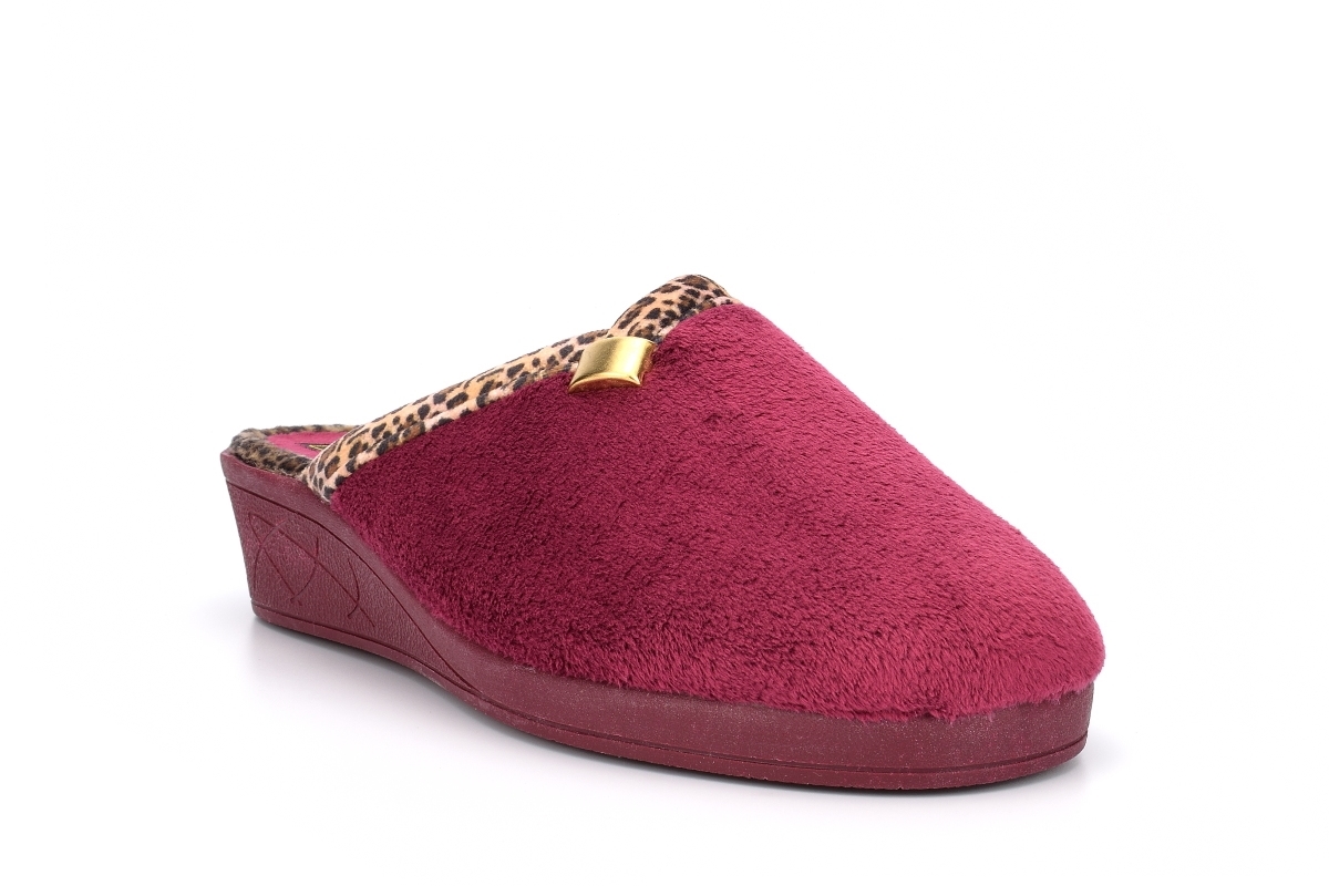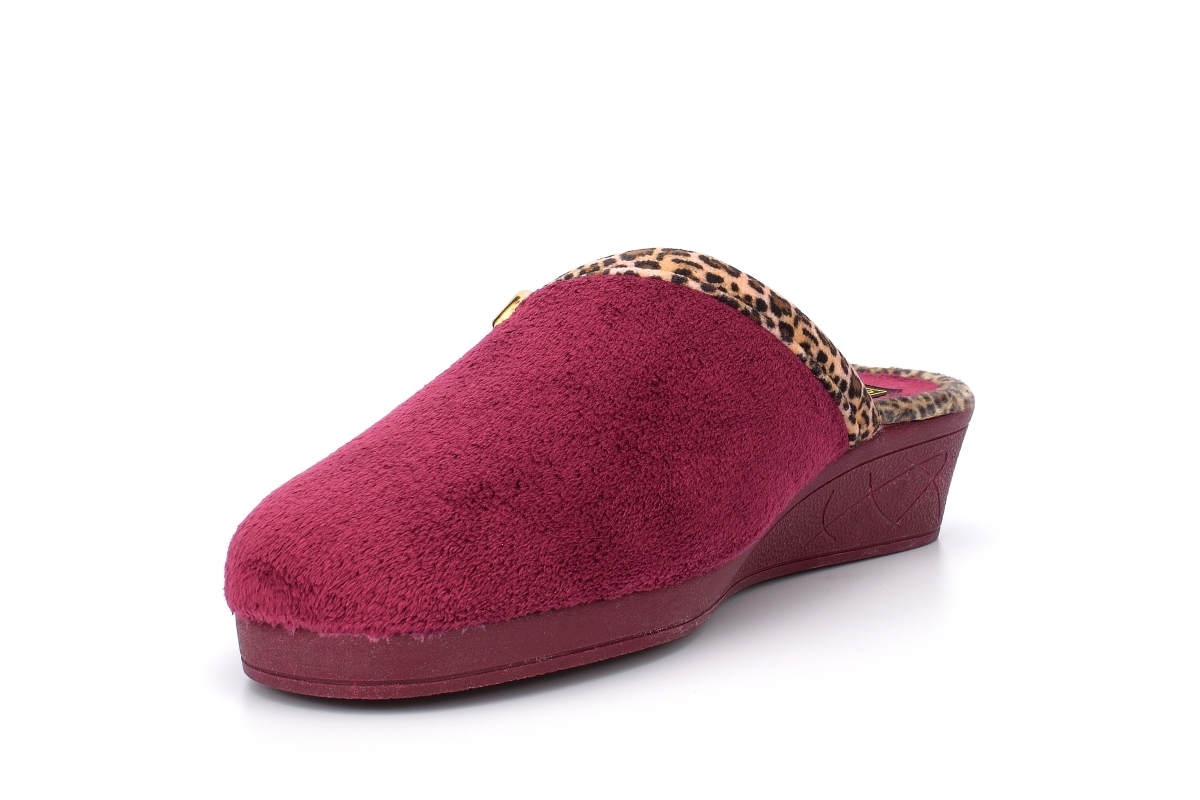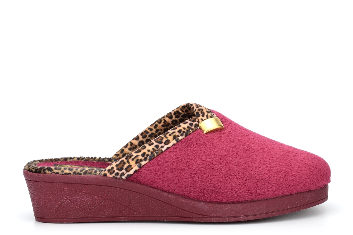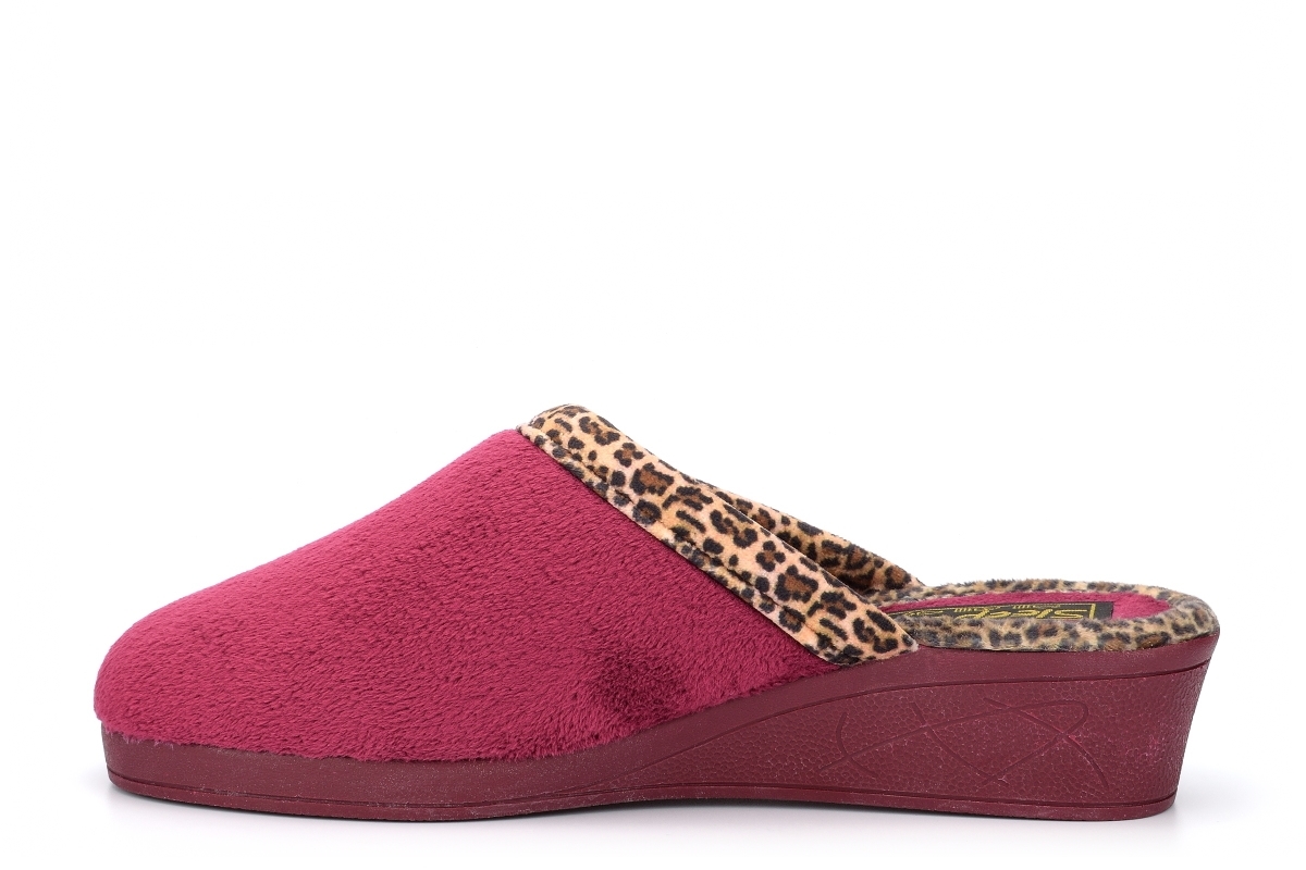 - Ladies mule slippers - Ocelot design binded cuff - Knitted lining and velour sock - Slip on slippers - Medium wedge heel - Rubber/TPR sole - Approximately 4 cm heel height for size 5