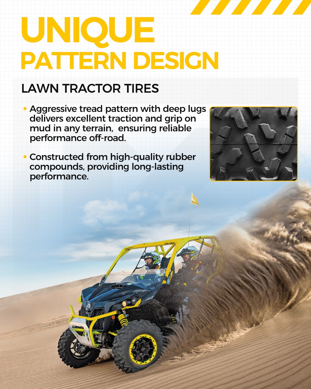 Features premium rubber in our hard compound to withstand the harshest racing conditions. A perfect replacement tire for your quad ATV, UTV, Go Kart, Golf Cart or Lawn Mower.