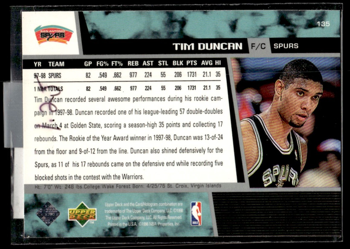 | 1998-99 Upper Deck Tim Duncan San Antonio Spurs #135 |