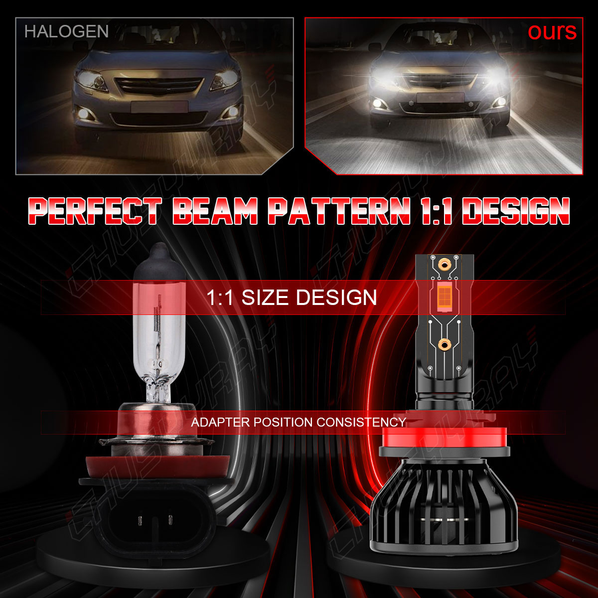 The light distribution distance is 1mm, and the position of the luminescent point is the same as the original halogen lamp, which does not affect sight of the incoming car.