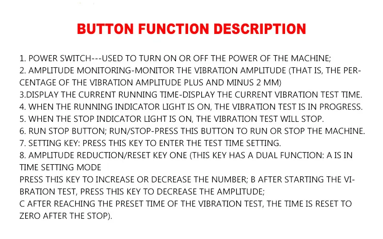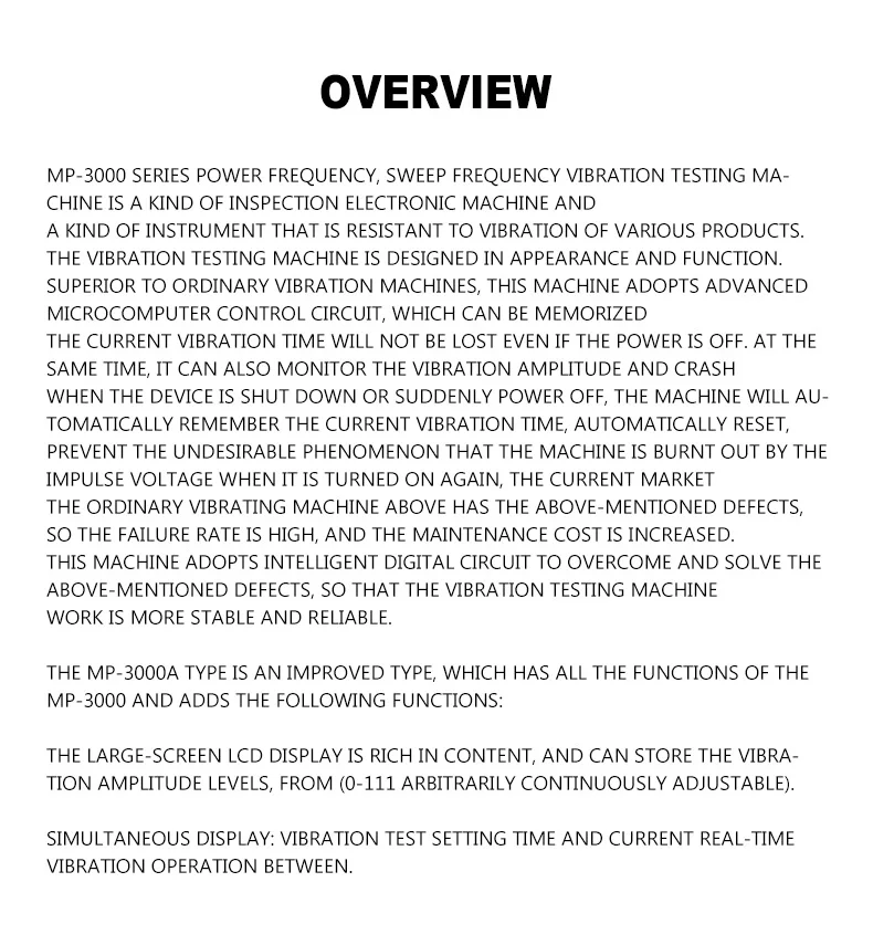Vibration Test Machine Bench Stereo Vibration Tester MP-3000A Power Frequency Vertical Vibration Table Machine 220V/110V product name:Vibration testing machinemodel:MP-3000AVoltage:220v/110VPower:1000WVibration amplitude monitoring indication:100% (display: 100)
