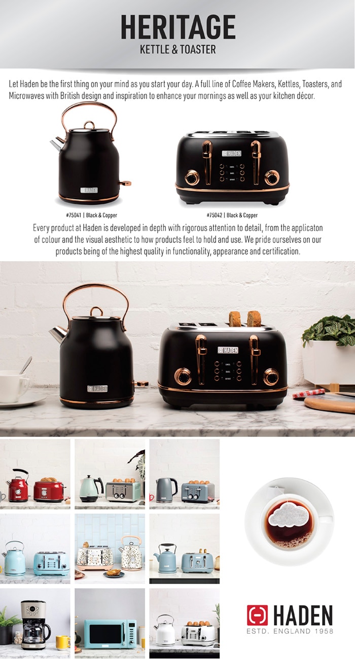 Created with a stylish, traditional design, the Heritage Toaster by Haden is a perfect home and kitchen accessory for adding a pop of color and brightening up your daily toasted snack routine. The Haden toaster features a cancel button, a self-centering function, a removable crumb tray for easy cleaning, and a retro browning control dial that allows you to select the perfect toasting setting for your bread, English muffin, or waffle. Whether you're more of a toasted bagel and cream cheese fan or a toasted bread and butter fan, or sourdough bread lover, this cute toaster has you covered when it comes to making a great-tasting toasted snack. Shop the full collection of Haden appliances for more colors and sleek kitchen gadgets like coffee machines, electric kettle and toaster sets, microwaves, and more.