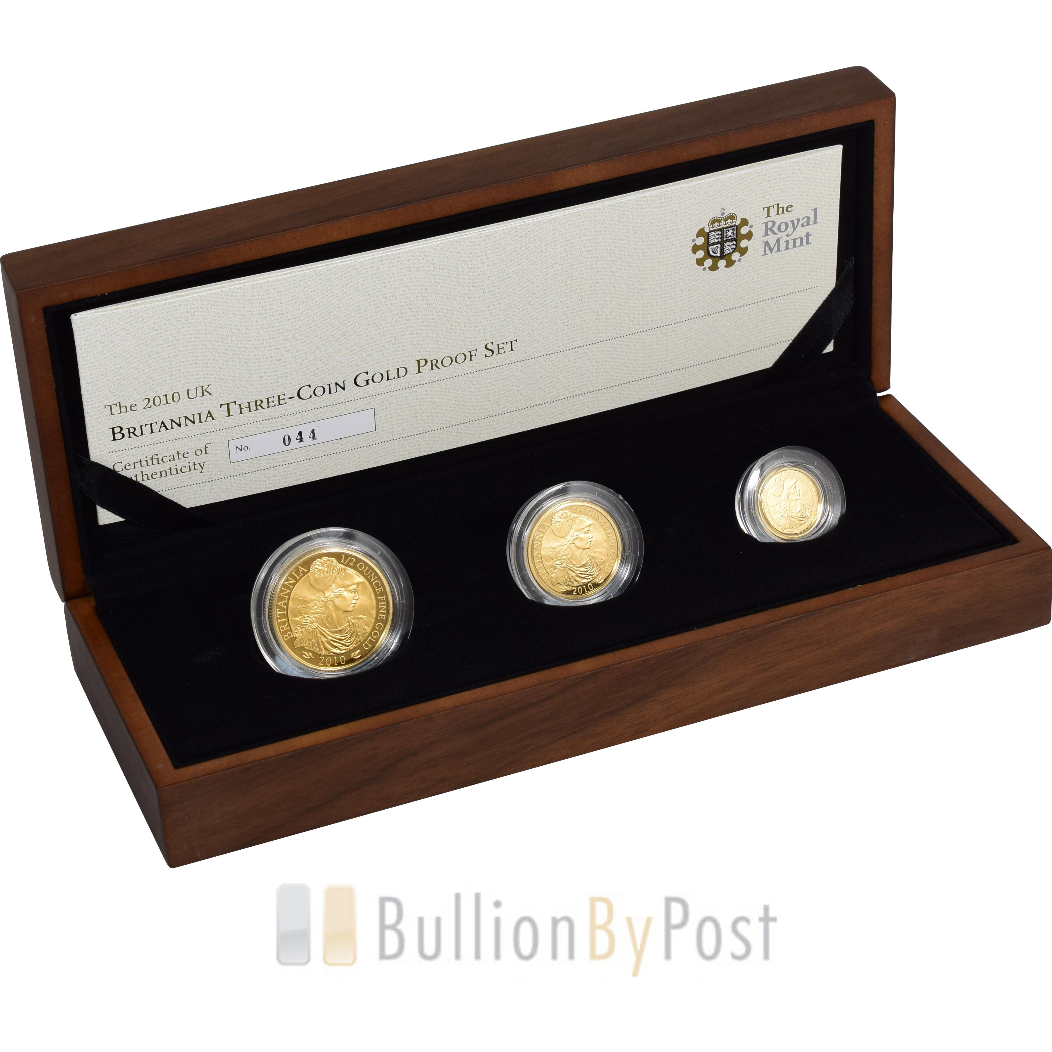 This stunning 2010 Proof gold Britannia 3-coin set is boxed with a certificate of authenticity. The Britannia set contains three gold coins; Half Ounce, Quarter Ounce and a Tenth Ounce.