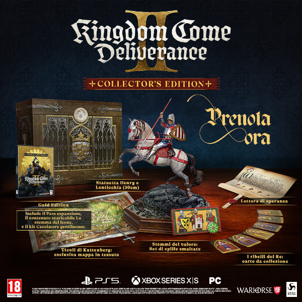Dalle strade brulicanti delle città alle foreste lussureggianti, riscopri un’Europa medievale open-world in questo RPG indimenticabile ricco di azione, brividi e meraviglia. Caratteristiche: Una storia di amore e vendetta: Vivi attraverso gli occhi e le azioni di Henry, un giovane in cerca di vendetta in seguito all’uccisione dei suoi genitori. La sua storia - illustrata da oltre cinque ore di splendide cutscenes - lo porta dall’essere un aspirante guerriero a un’anima ribelle, e a incrociare sulla sua strada un carismatico cast di personaggi e una serie di avventure indimenticabili, scontrandosi con diverse figure di rilievo quali il Re d'Ungheria, Sigismondo la Volpe Rossa e i suoi temibili alleati. Una vera esperienza RPG: Le tue azioni determinano il destino di Henry e il modo in cui il mondo reagirà nei suoi confronti. Personalizza liberamente il suo aspetto, le sue abilità e il suo equipaggiamento, prendendo decisioni a livello etico sugli eventi che ti circondano. Viaggia per il mondo impegnandoti in attività uniche per immergerti al massimo in questa vibrante parte d'Europa che ricorderà per sempre le vostre azioni. Vivi una vita medievale: Una rappresentazione estremamente autentica della Boemia del XV secolo ti permetterà di vivere questi affascinanti luoghi come mai prima d'ora. Perditi in una città tentacolare, confrontati con i contadini e parla con i nobili mentre esplori le vaste campagne ricche di taverne, terme, castelli e molto altro. Autentico combattimento in prima persona: Immergiti negli scontri e nei viscerali combattimenti cimentandoti in emozionanti battaglie in tempo reale. Avrai a disposizione un’ampia gamma di armi e diversi stili di combattimento, autentici e adattabili ad ogni tipologia di giocatore. A piedi o a cavallo, potrai specializzarti nell’elegante arte della spada, nelle brutali armi contundenti o nei micidiali attacchi a distanza. L'edizione contiene: Gioco base Kit del prode cacciatore (DLC) Expansion Pass (3 espansioni in arrivo prossimamente) Scudi del passaggio di stagione (bonus sbloccabile dal Day One) Contiene: Tutti i contenuti della Gold Edition; Missione bonus Lo stemma del leone; Statuetta di Henry e del suo fidato destriero, Lenticchia; Mappa esclusiva in tessuto Vicoli di Kuttenberg; Set di spille smaltate Stemmi del valore; La Lettera di speranza che fu affidata a ser Hans Capon; Set di carte collezionabili I ribelli del Re. |
