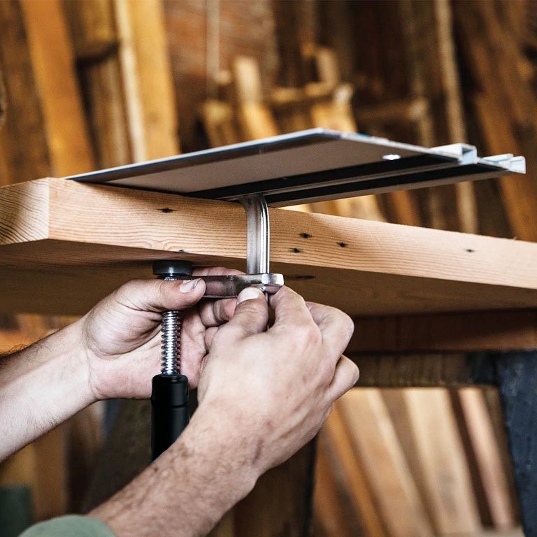 Holds guide rails or material firmly in place.