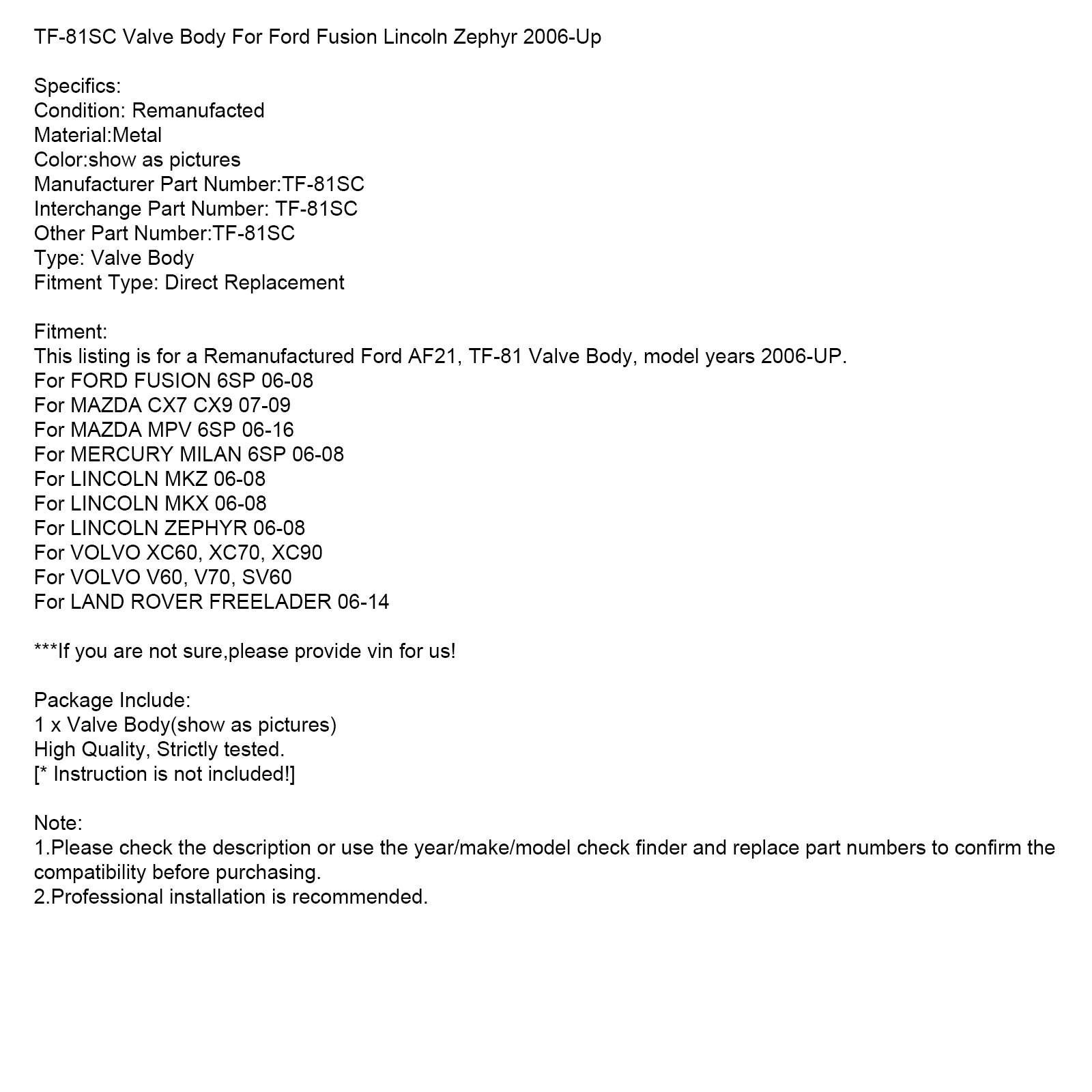 Fitment: This listing is for a Remanufactured Ford AF21, TF-81 Valve Body, model years 2006-UP. For FORD FUSION 6SP 06-08 For MAZDA CX7 CX9 07-09 For MAZDA MPV 6SP 06-16 For MERCURY MILAN 6SP 06-08 For LINCOLN MKZ 06-08 For LINCOLN MKX 06-08 For LINCOLN ZEPHYR 06-08 For VOLVO XC60, XC70, XC90 For VOLVO V60, V70, SV60 For LAND ROVER FREELADER 06-14