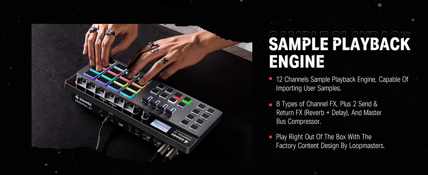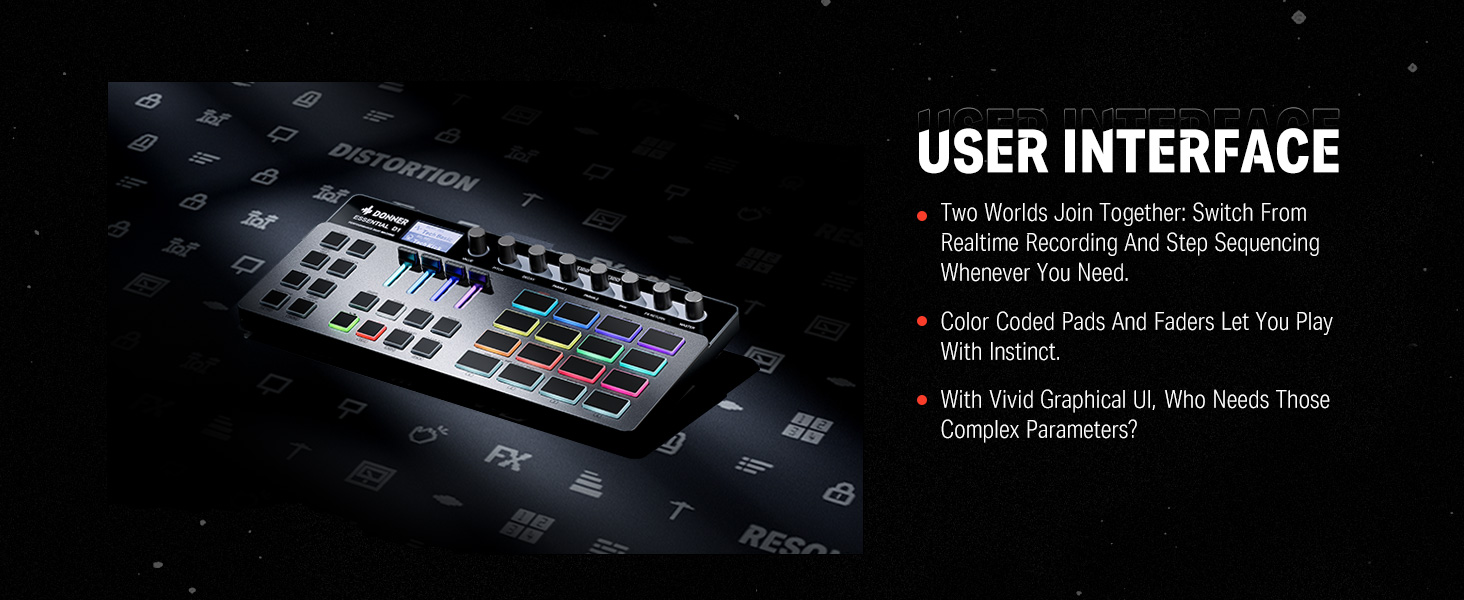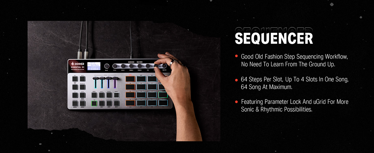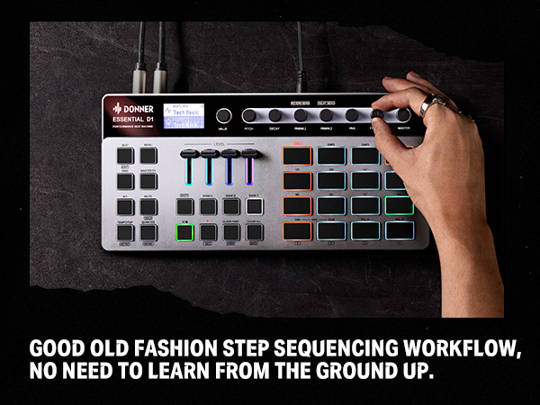 Interaction Upgrade, Play with Instinct - Donner Essential D1 Drum Machine blends two workflows into one machine. Both finger drumming and step sequencing can switch freely. It is easy to switch between two workflows, which makes it incredibly straightforward for you to produce music