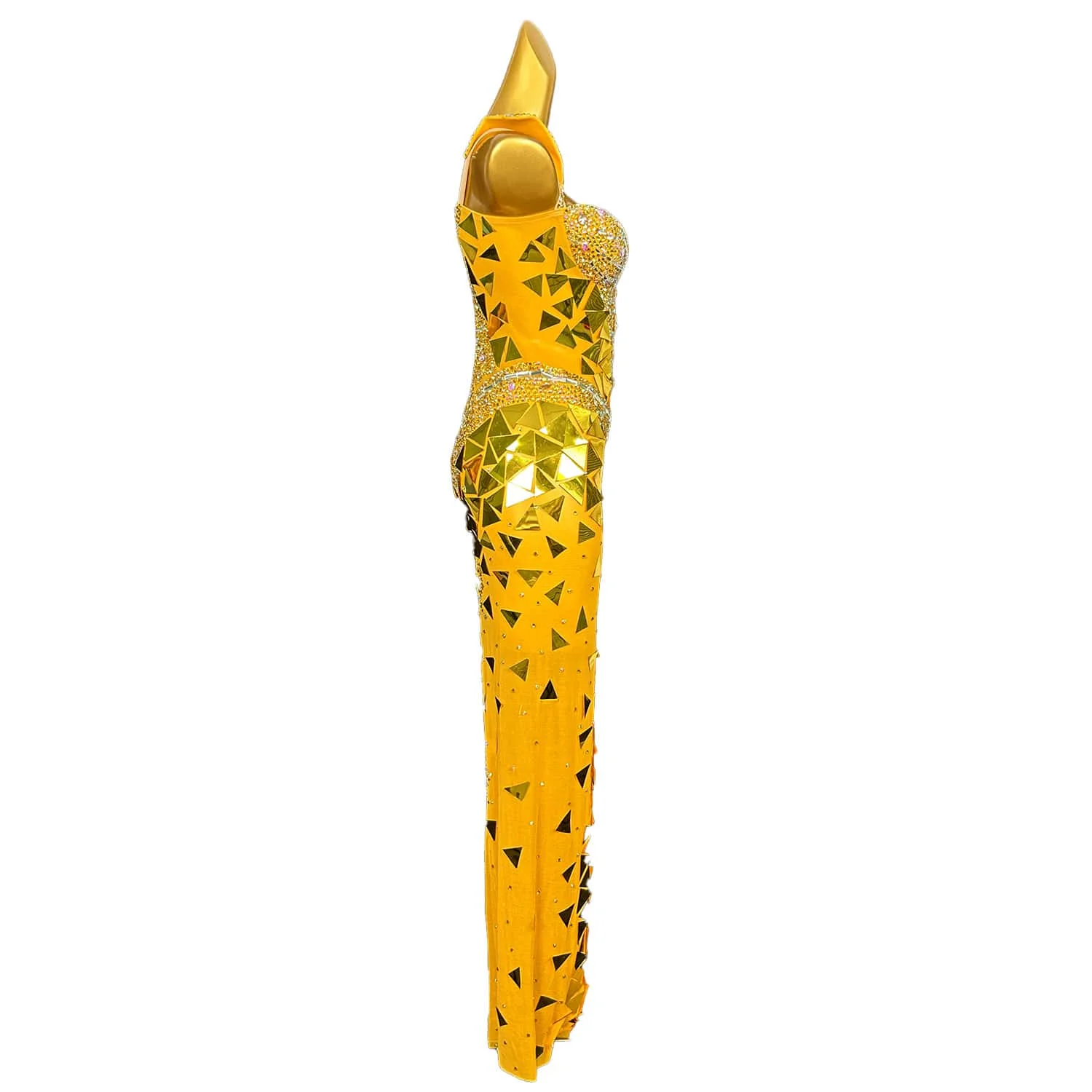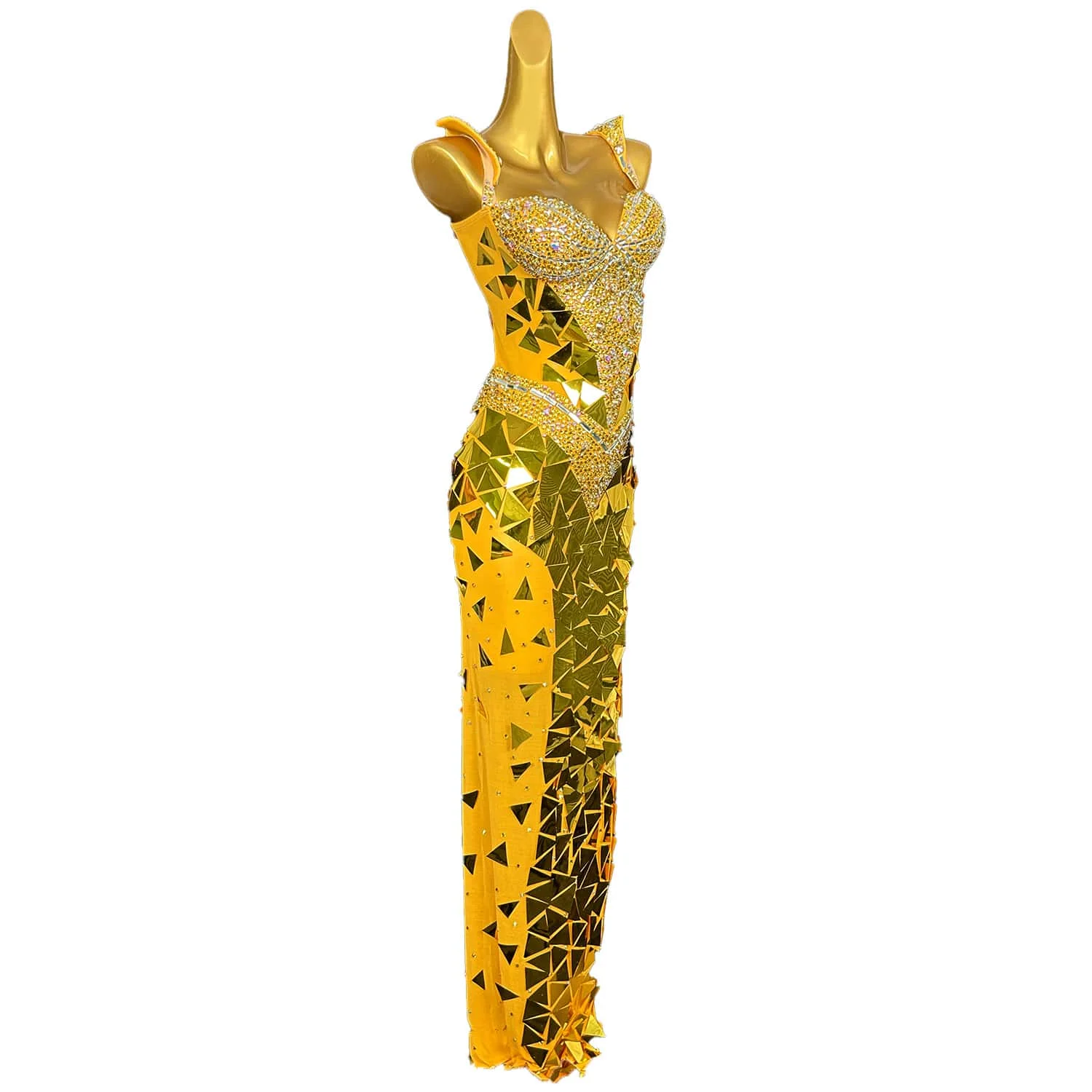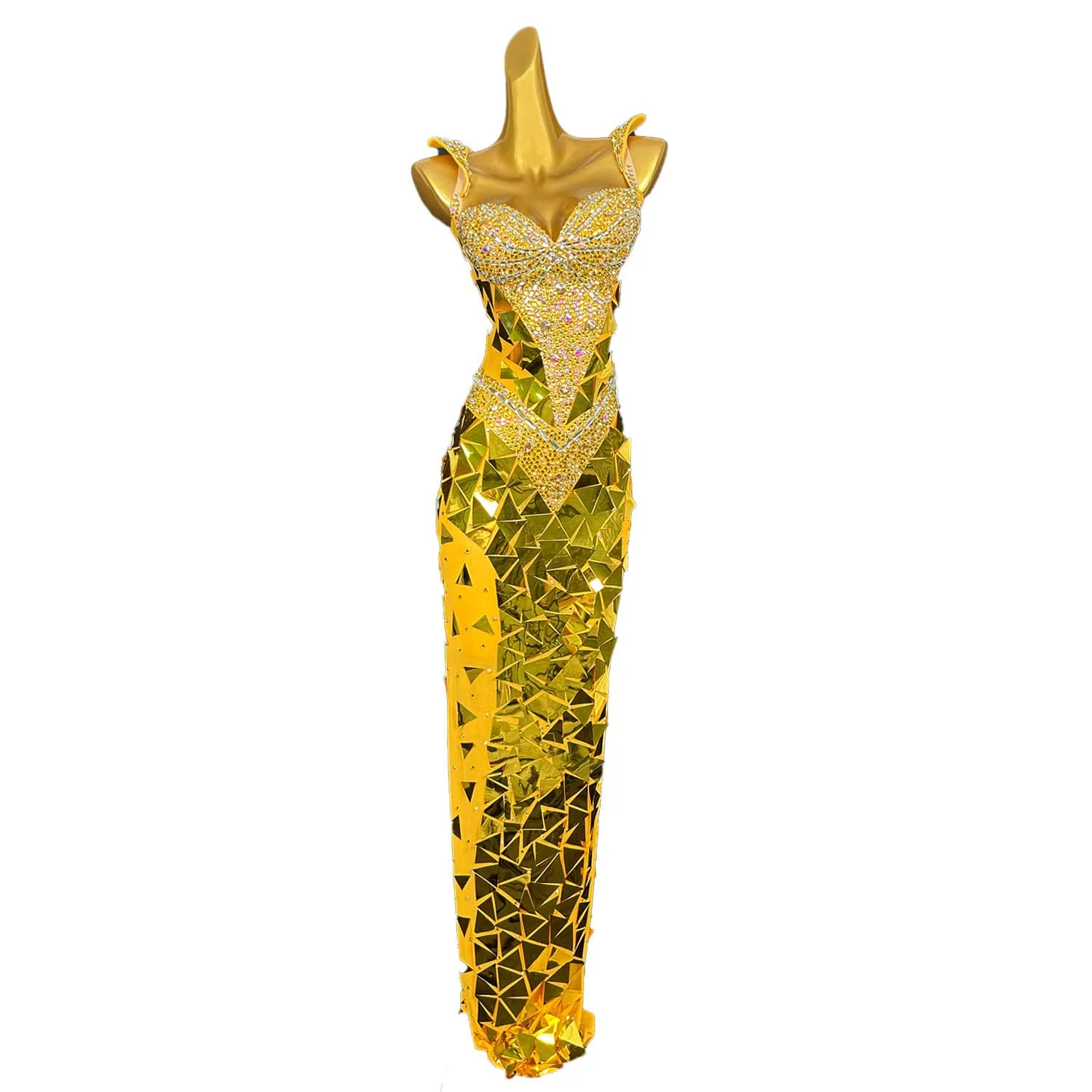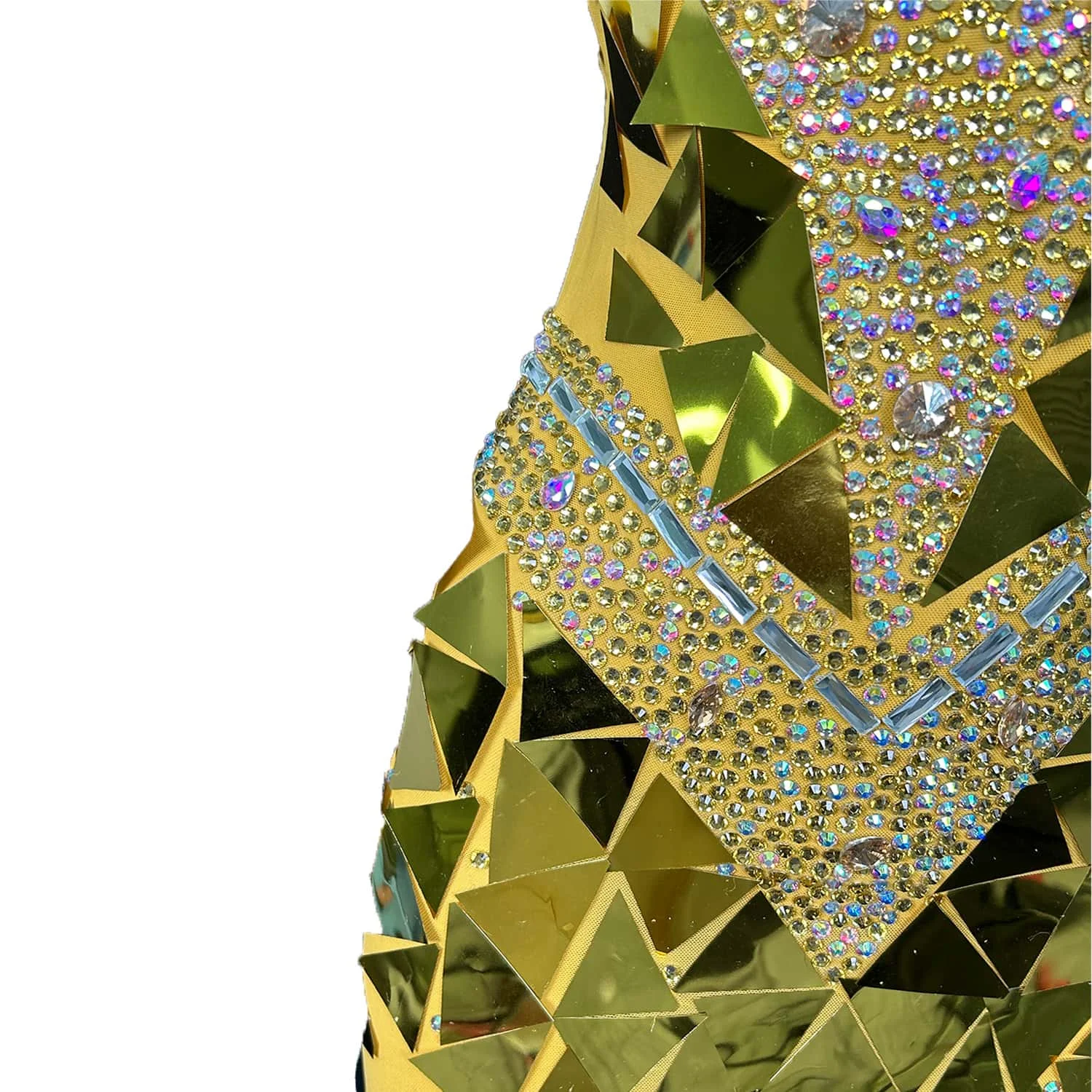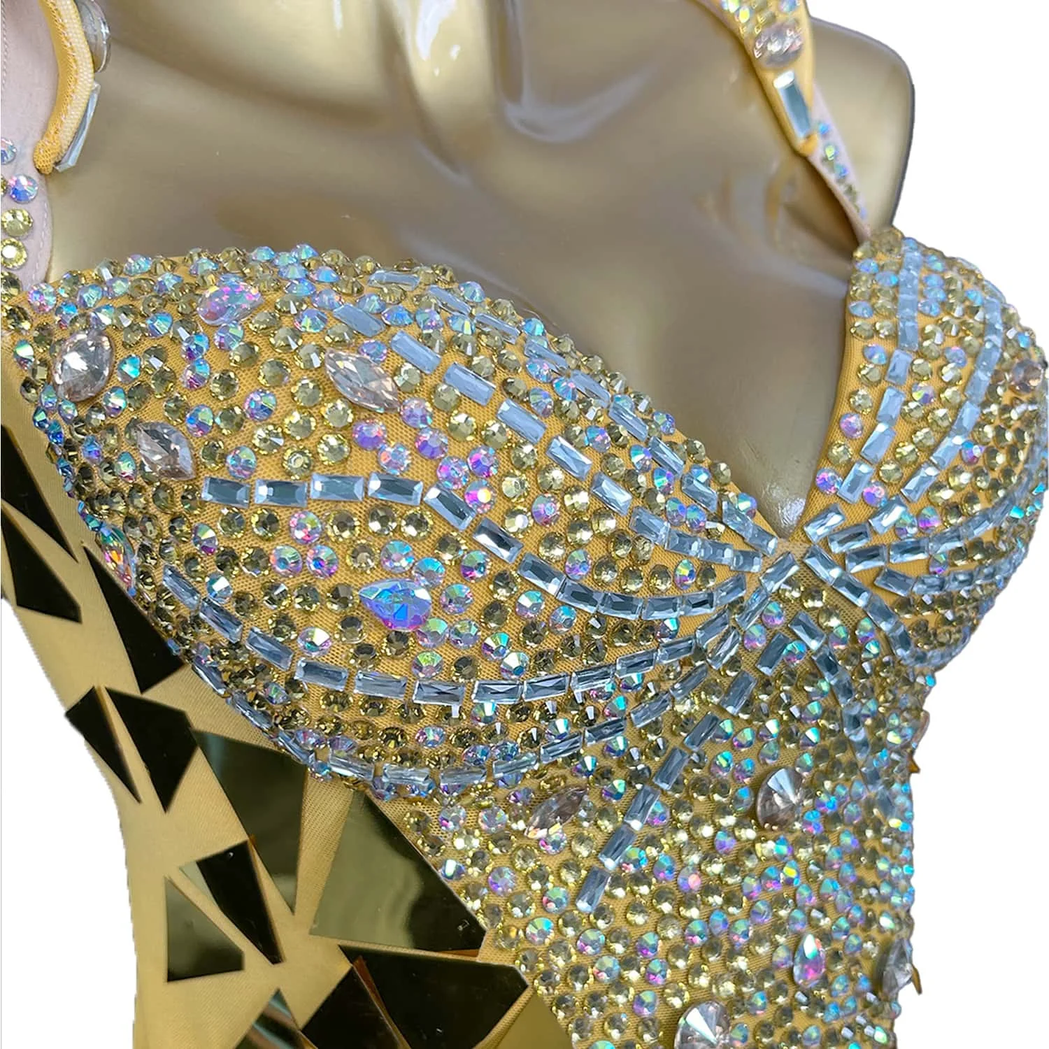 Crystals Evening Celebrate Gown Show Stage Wear Women Sexy Wedding Party Birthday Dress Gold Mirror Nightclub Outfit Jinjingpian