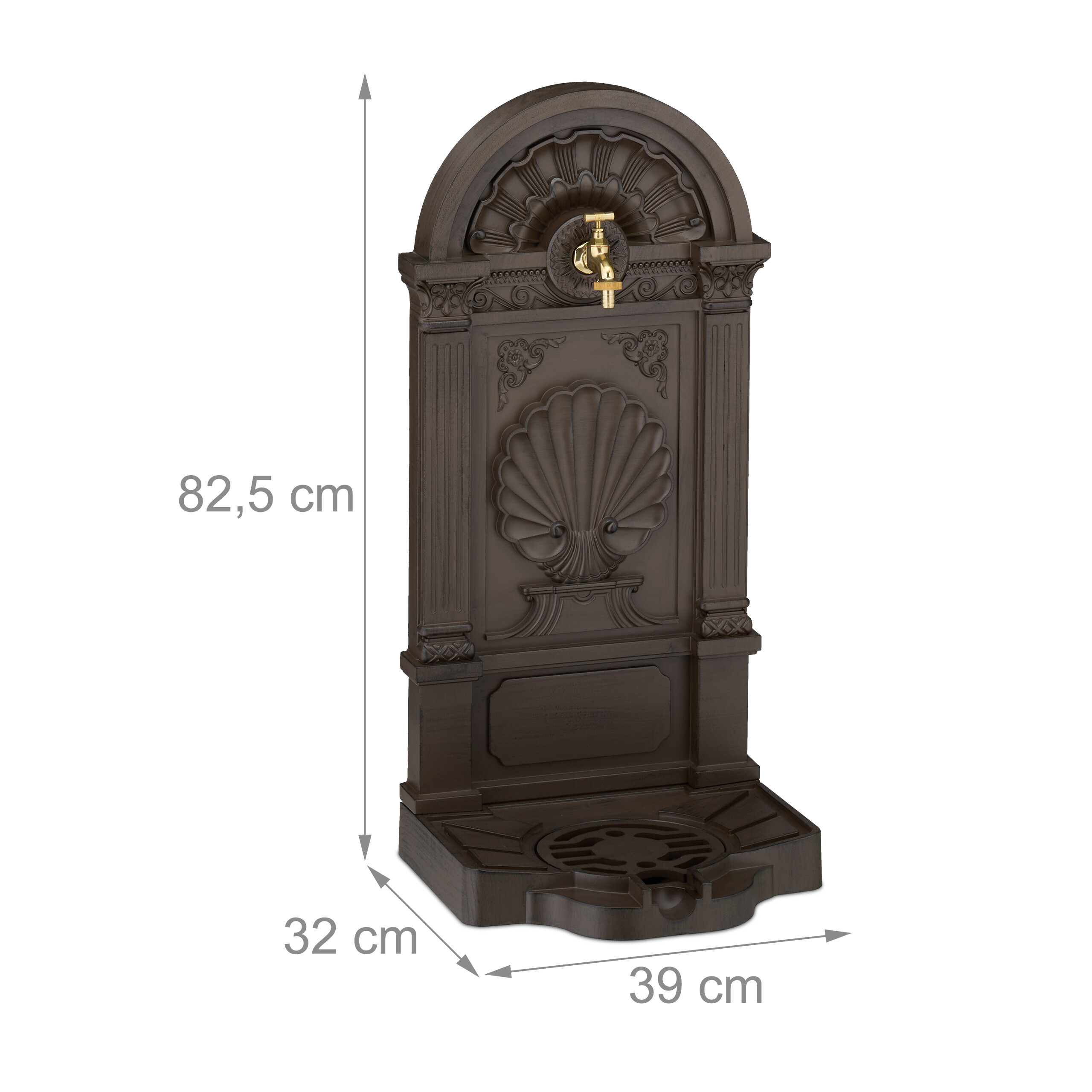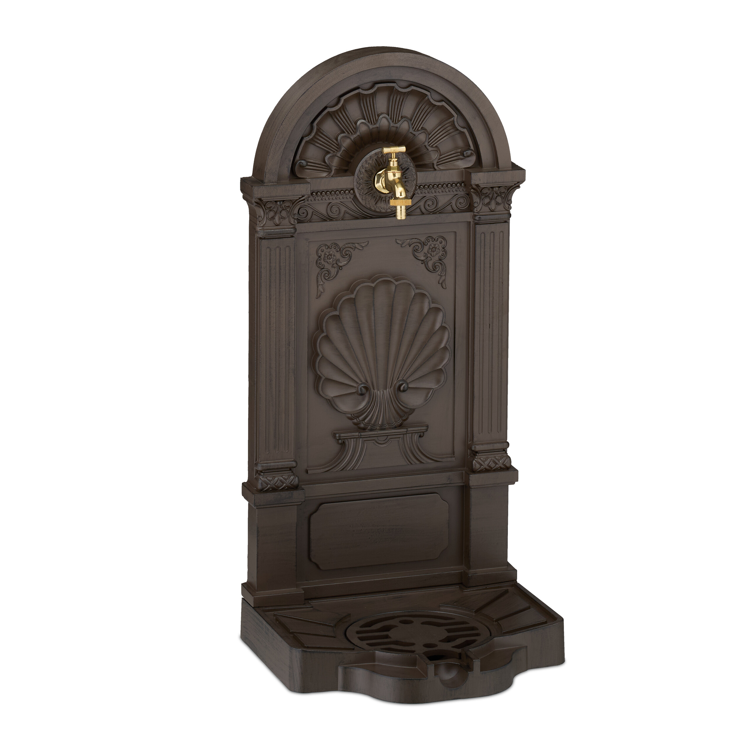 Verleihe Deinem Garten oder Deiner Terrasse nostalgischen Charme mit diesem Standbrunnen im Antik-Design. Egal ob rein dekorativ, zum Hände waschen nach der Gartenarbeit oder zum Wasser holen - der Metallbrunnen macht immer eine gute Figur. Der Gartenbrunnen ist mit einem Wasserhahn und einem runden Becken ausgestattet. Das Gitter ist ideal zum Abstellen von Gießkannen. Der aufwendig gestaltete Zierbrunnen mit beeindruckendem Muschel--Motiv kann freistehend oder an der Wand platziert werden.