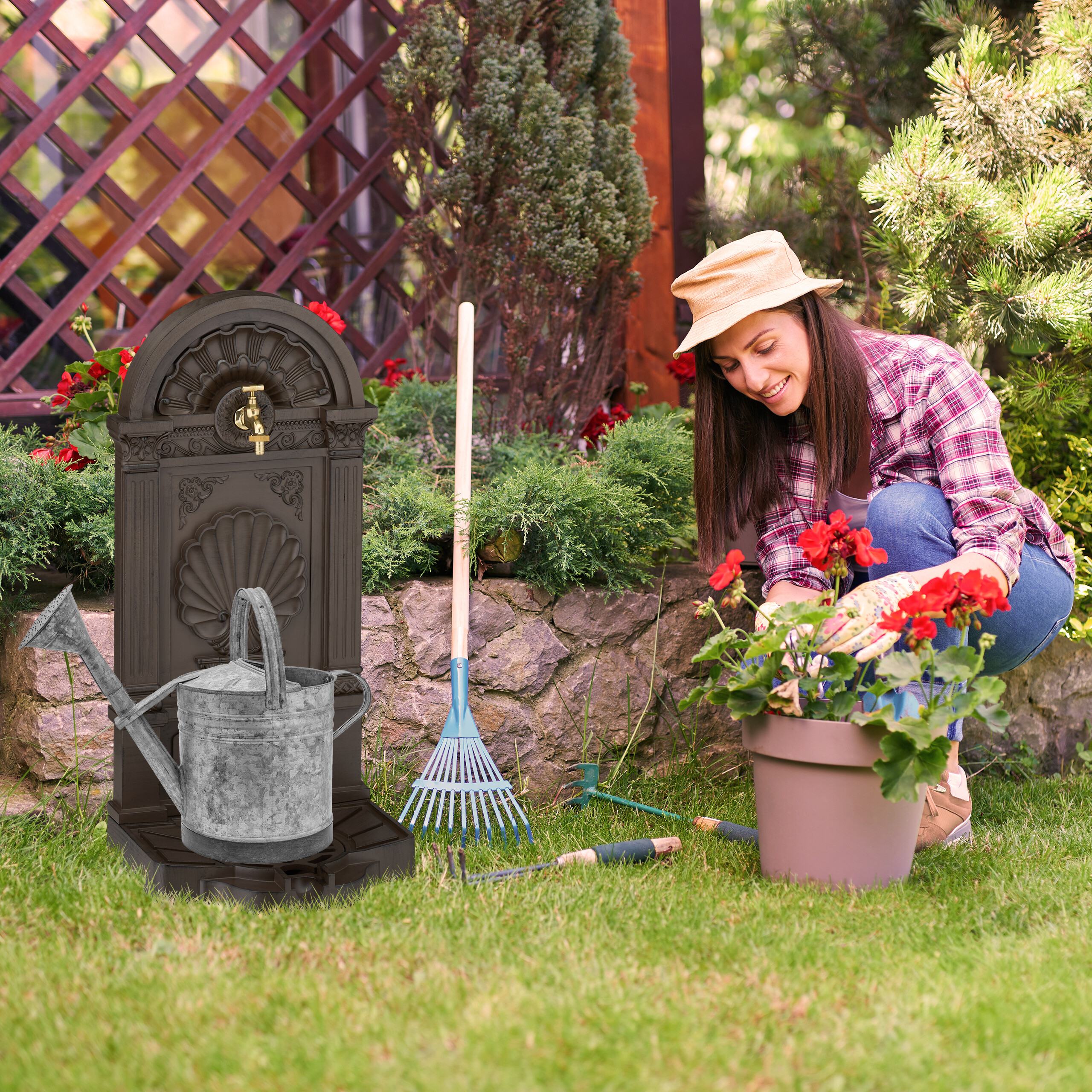 - Praktisch: Gartenbrunnen mit Wasserhahn und kleinem Becken - Mit Gitter zum Abstellen von Gießkannen